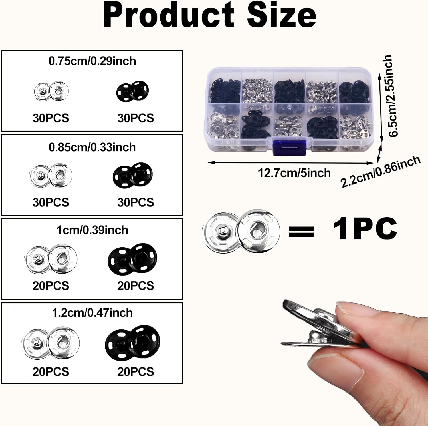 Discover the versatility and quality of our set of 100 sewing press studs, ideal for anyone who loves sewing or implementing DIY projects. With four different sizes and two color options, these snaps provide a flexible solution for your creative needs. The press studs are made of high-quality metal copper, which guarantees a long service life and resistance to external influences. The ease of use makes them an essential part of your sewing supplies, ideal for quick repairs or designing new pieces. The included transparent storage box helps you keep the snaps neat and within easy reach. Whether you're crafting professional garments or realizing personal DIY projects, these snaps provide the quality and flexibility you need. Use the variety of this set for your creative projects. The classic colours black and silver can be easily combined with different fabrics and offer an aesthetic solution to any design. Make your garments and accessories unique with our reliable and stylish snaps.