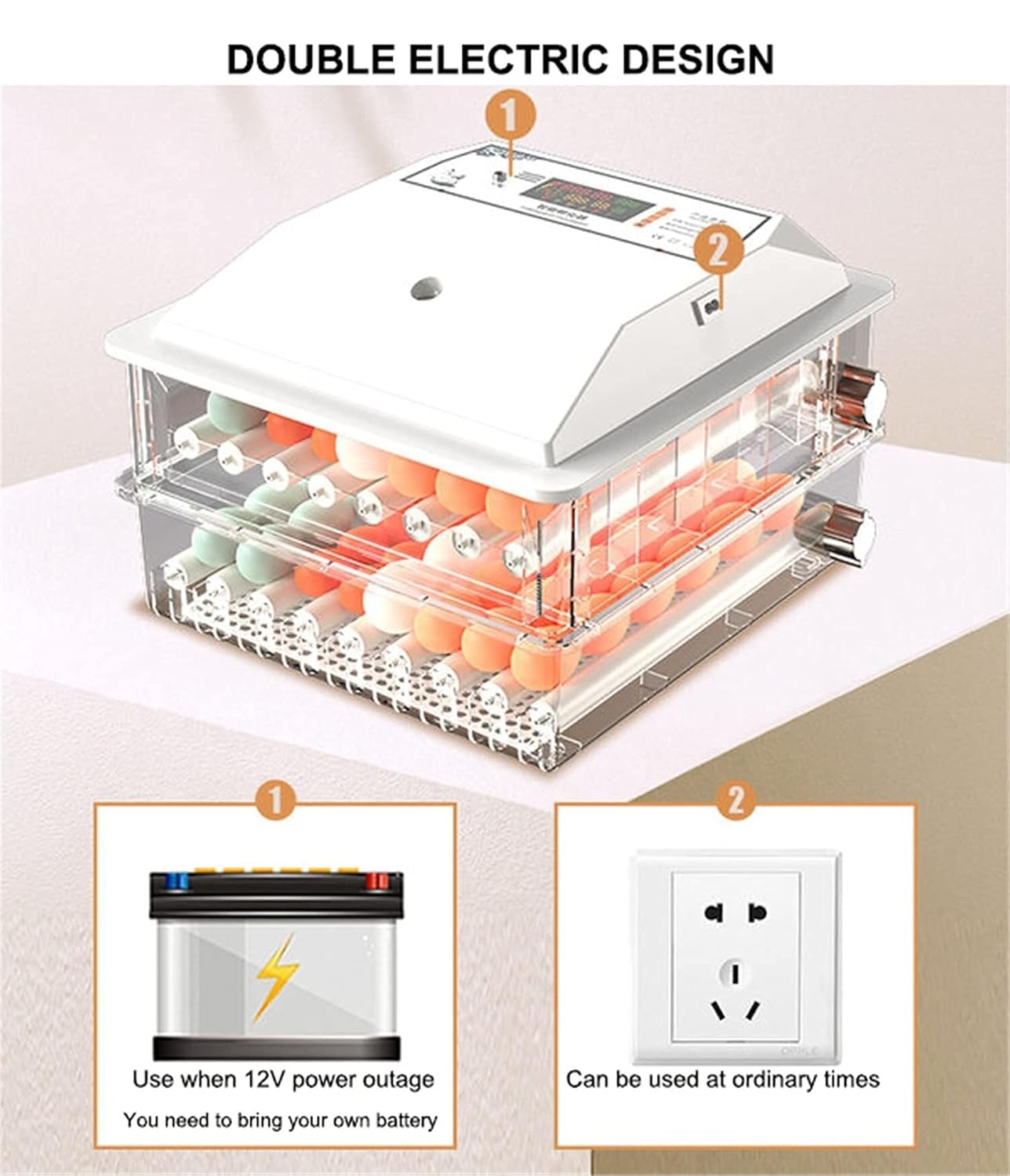 The 3-in-1 Intelligent Egg Incubator is a versatile and easy-to-use poultry hatcher designed for those looking to hatch a variety of eggs, including chicken, duck, goose, quail, and more. With a capacity of up to 120 eggs, this incubator is perfect for small-scale poultry farming, educational purposes, or hobbyists. It features automatic egg turning every 2 hours, optimal heat distribution for better hatch rates and less manual labor.Equipped with an LED display, you can easily monitor and adjust the temperature, humidity, and hatching progress. The built-in egg candler allows you to easily track the development of eggs at every stage, providing peace of mind and clarity throughout the incubation process.This incubator is designed with in mind, operating with low noise and low power consumption while maintaining a consistent temperature and humidity level. The foam insulation box better heat retention, even in cooler environments, and the transparent design allows you to visually observe the hatching process without disturbing the eggs.Key Features:Temperature & Humidity Control: Automatic regulation to maintain optimal conditions.Automatic Egg Turner: Every 2 hours, for even heat distribution and enhanced hatchability.LED Display & Egg Candler: Displays temperature, humidity, days, and countdown; built-in candler for checking egg development.Dual Power Supply: Supports 110V/220V home power and 12V battery backup in case of power failure.User-Friendly & Educational: Ideal for kids, educational programs, or anyone wanting to learn about life cycles through hands-on experience.Specifications:Voltage: 110V/220VPower: 80WMaterial: Sturdy PP plasticColor: WhiteSize: 71 x 47 x 25 cmCapacity: 98 or 120 eggsWeight: 5.7 kgPackage Includes:1 x Egg Incubator1 x Power Cable