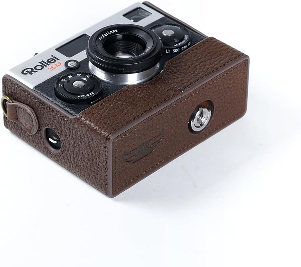 This camera is made by real top layer oil leather, the design is simple and vintage, use Metal sizing techniques make it very fit with the camera body. Inside lining use high lever velvet to protect camera body for scratch and coloration. Under base screw is made by copper and it can easy take off by coin. You don't need to take off the half case when you use tripod. It has a special design for Rollei 35AF Camera which makes it easy to turn over the Screen and it will totally not affect screen rotation. You don't need to take off the half case when you connect data lines. Content: 1 x camera half case, 1 x Lens Cover, camera not included. Material:Genuine leather.