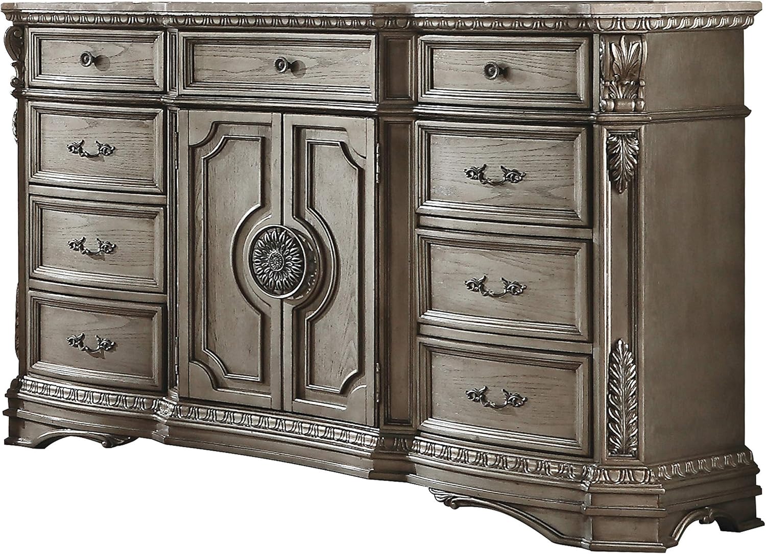 The Northville wooden top dresser is exclusively designed and filled with romantic spirit. A piece crafted and inspired by the luxurious designs of the past, this gorgeous dresser features a shaped wooden top and plenty of storage space with its nine large drawers and large two-door cabinet in antique champagne finish. With floral accents, raised crown molding and scrolled corners this uniquely designed dresser will make a statement in any bedroom.