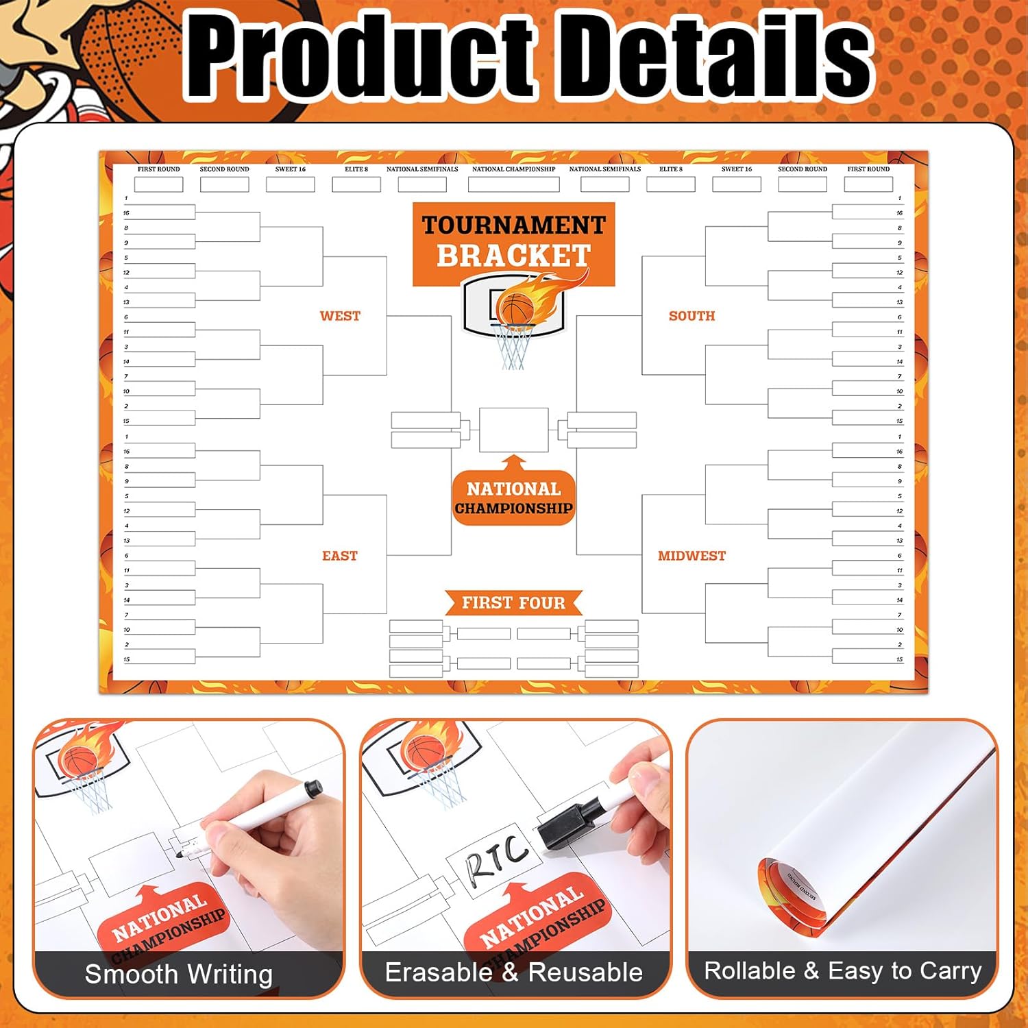 This basketball tournament bracket poster set includes everything you need: a 19 x 13-inch bracket poster, 6 dry erase markers, 9 adhesive dots, and a square eraser. It's ideal for organizing your next basketball event, whether it's for March basketball tournament. Crafted from durable paper material, the basketball dry erase bracket offers a long-lasting solution for tournament tracking. The sturdy design resists tearing, and the dry erase markers with eraser ensure easy updates. Ideal for multiple uses in both men’ s basketball tournament bracket poster sets and other fun events. Specification: Material: Paper Color: Orange Size: 19 x 13 inches Package Includes: 1 x large basketball bracket poster 9 x adhesive dots 6 x colorful magnetic markers 1 x orange square eraser(2 x 2 x 0.8 inches) This versatile basketball bracket board tournament set is ideal for classrooms, offices, or parties. It's a great way to engage with your basketball bulletin board decorations or track your 64 team tournament bracket large. Easily portable, this set offers fun and functionality for any basketball fan.