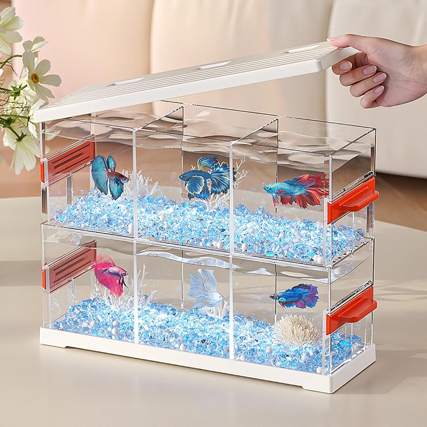 Small Betta Fish Tank, Stackable Mini Fish Tank Aquarium Tank Kit, Rectangular Fish Bowl with Aquarium Gravel Decoration, Cube Tank for Turtle Reptile Shrimp Crab Insects as DecorationFeatures- Small betta fish tanks can be used as a feeding box for tiny aquatic animals such as shrimp and small fish, and can also be used as a viewing box for seaweed and moss balls.- The surface of our fish tank is smooth and burr-free, safe for both people and fish.small aquarium fish tank can raise betta, guppies, angelfish, other ornamental fishes, turtle, reptile, jellyfish, shrimp, crab, and insects.-Our mini fish tank can be the best gift to send to your kids, classmates, friends, colleagues, and family for festival days or birthday parties.Specifications- Materials:ABS Plastic- Color:Clear- Feature:StackablePackage Included1set*Small Betta Fish Tank