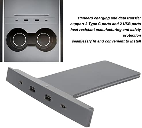 1. Applicable Model: The car USB hub is perfect replacement for Tesla 3 Y 2021 +, please check the model and year before ordering. 2. Excellent Performance: PD port supports 27W output, with 2 Type C ports and 2 USB ports. Built in temperature protection, this car USB hub is heat resistant. 3. Textured Appearance: Our USB hub is made of sturdy ABS and metal materials, which makes your central control more elegant and classic. 4. Multiple Purpose: This USB hub supports standard charging and data transfer, which is suitable for smart phone, tablet, gamepad, notebook or digital camera. 5. Convenient Operation: Integrating seamlessly with the center console, and it does not affect the use of the central control switch and storage box, and can be easily installed. Specification: Item Type: Center Console USB Hub Fitment: Replacement for Tesla 3 Y 2021 + Package List: 1 xUSB Hub 1 x Power Line