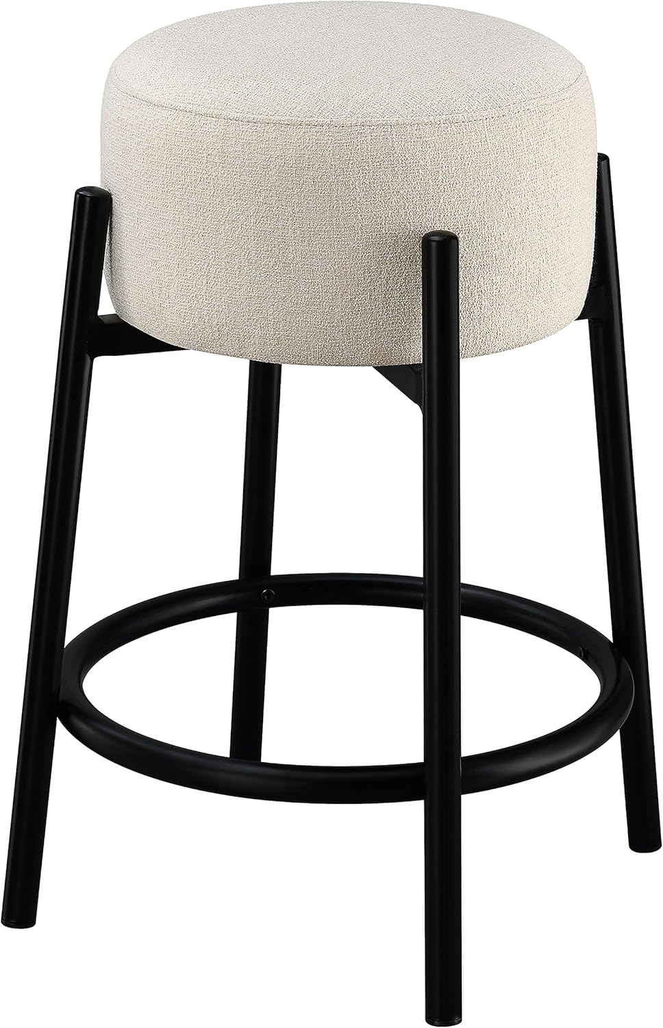 Striking in its mid-century modern style, this set of 2 counter chairs presents a seamless blend of elegance and function. The white fabric upholstery complements the sturdy engineered wood frame, while the backless, armless design ensures effortless versatility. With 25-inch seat height and a built-in footrest, these white and black counter stools provide both comfort and practicality, making them ideal for a kitchen island or dining room. Dimensions: Counter Stool Seat Dimensions: 25 inches high x 13.5 inches wide x 13.5 inches deep