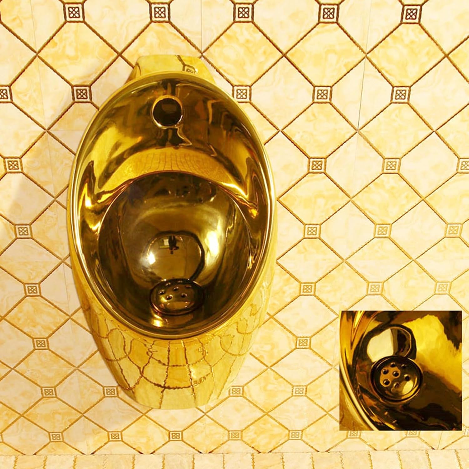 Commercial Washout Urinal Induction Adult Urinal Space-saving Urinal Universal Washout High Efficiency UrinalThis Wall mounted urinal is made of ceramic with a luxurious golden finish, featuring a smooth glazed surface that resists while adding elegance to any restroomThe Sensor flush urinal uses a powerful waterfall flushing system, covering a wider cleaning area while saving water and maintaining hygiene with every useDesigned for convenience, these Urinals for men include a humanized anti-clog structure and deep edge design to effectively prevent overflow and reduce maintenance needsThe elegant arc-shaped style and space-saving wall-mounted design make this urinal suitable for hotels, offices, restaurants, and upscale residential bathroomsSpecifications:Name: Urinals for menMaterial: Ceramic + sensorDimensions: 27x27x68cm/10.63x10.63x26.77inColor: GoldMounting: Wall-mountedDrainage: Wall-mountedUse: Bathrooms, bars, apartments, restaurants, shopping malls, airports, hospitals, schools, and other public restrooms.Packaging: 1 urinalNotes:1. Please confirm the style and size before purchasing.2. Please ensure proper installation of the water inlet and outlet.3. Due to manual measurement, there may be a 1-3 cm discrepancy. Please refer to the actual product for accuracy.
