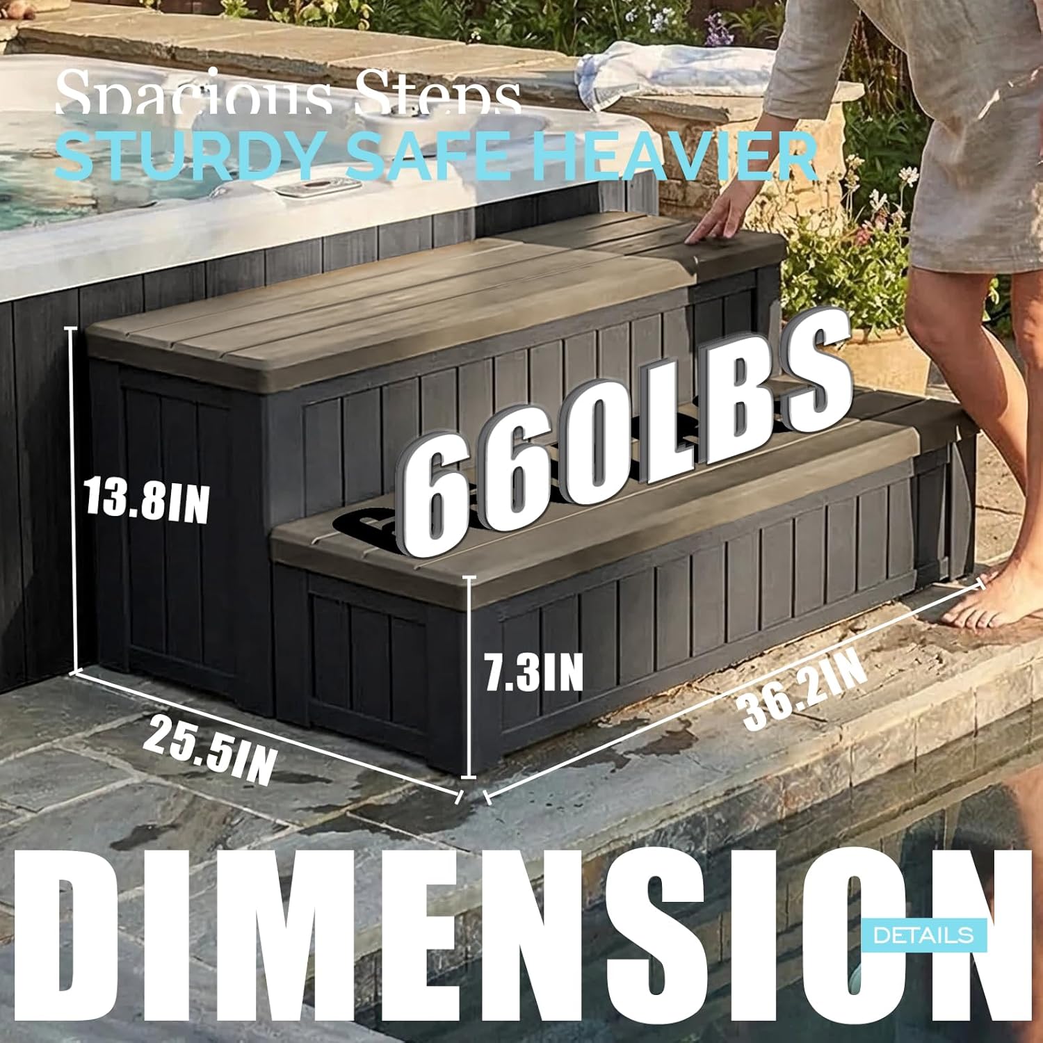 Introducing our Waterproof Resin Hot Tub Steps with Storage—the ideal solution for safe and convenient access to your hot tub or swimming pool. Designed with a non-slip surface for stability, these durable steps ensure your safety while getting in and out. They also feature a hidden storage compartment to keep hot tub accessories and toys organized. With quick and easy assembly, these versatile steps complement any outdoor space, making them perfect for patios and pools. Enhance your outdoor experience with our reliable hot tub steps!