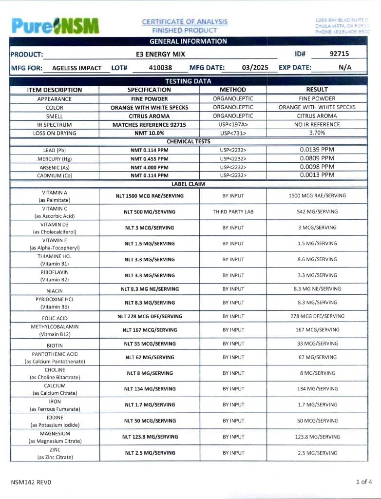 E3 is a revolutionary, new, energy drink combining powerful nutritional "energizers." Each serving packet now with an amazing 1,000 mgs of pharmaceutical-grade L Carnitine And Loaded With B12. Each container has 30 convenient servings of E3 Energy Mix. Compare and discover why this is one of most cost-effective sources of L Carnitine on the market today at 30,000 mgs per 30 serving container. E3 is a revolutionary, new, energy drink combining powerful nutritional "energizers." At the heart of E3 is L Carnitine, a nutrient that is a catalyst for energy production at the cellular level. Unlike many fad drinks that bring you up with a lot of caffeine, sugar, or worse, E3 actually supplies your body with many of the nutrients it needs for vibrant energy levels. Plus the energy is designed to last all day! E3 contains: No ephedra No added caffeine No sugar No sodium Only 6.7 calories Less than 1 gram of carbohydrates E3 helps provide muscle energy and helps enhance brain clarity for hours; unlike many chemical type energy formulas which only give you a "rush" that is gone in 20 minutes, often leaving you feeling more tired than before you took the product. Whether you're an athlete or a professional on the go, you need to put back what the day takes out of you. E3 is formulated for all day energy! Experience it for yourself and feel the difference! PLEASE NOTE PRODUCT EXPIRATION - On the bottom of the box the manufactured date is stamped. Our product has a shelf life of 3 years from the date it is manufactured.