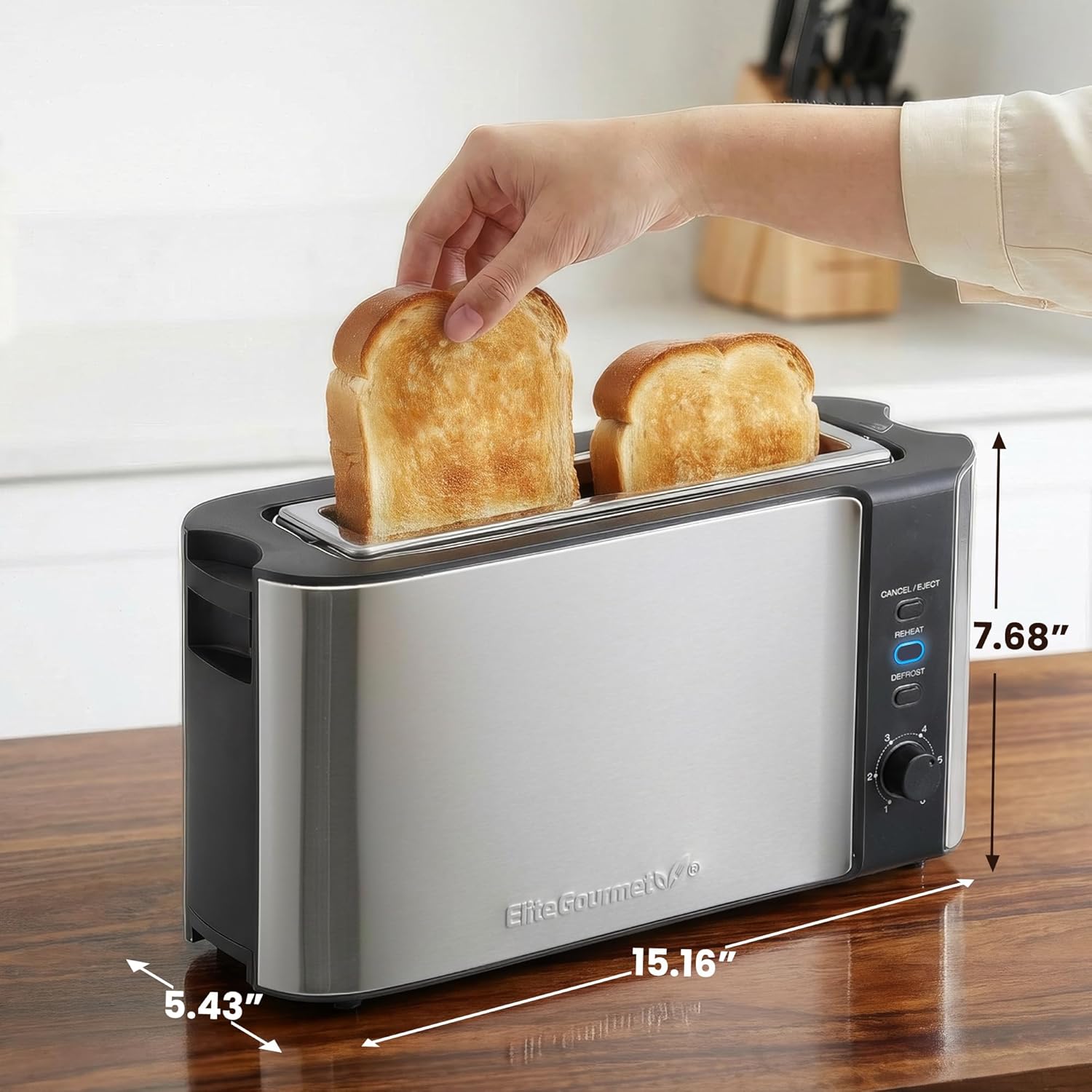 The Stainless Steel 2-Slice, 1 Long Slot, Slim Toaster can toast a wide variety of your favorite breads. The large toasting slot can accommodate longer, rectangular slices of bread such as sourdough or other artisanal loafs. It features 6 variable toast shade settings as well as Cancel, Defrost, and Reheat functions all encased in a sleek, modern, stainless-steel housing. The extra-long space saving design easily fits 2 slices of toast while not cluttering your countertop.