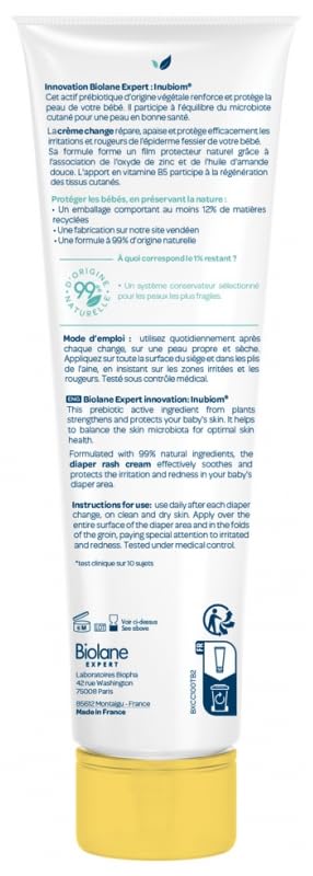 Expert Nappy Cream 100ml is a cream that effectively repairs, soothes and protects the irritations and redness of the diaper area of your baby. The intake in vitamin B5 participates to the regeneration of cutaneous tissues. The inubiom contained in the cream is an active ingredient of vegetable origin that strengthens and protects the skin of your baby. It participates in the balance of the cutaneous microbiome for a skin in good health. Tested under medial control. 98% of the ingredients are of natural origin. Made in France.