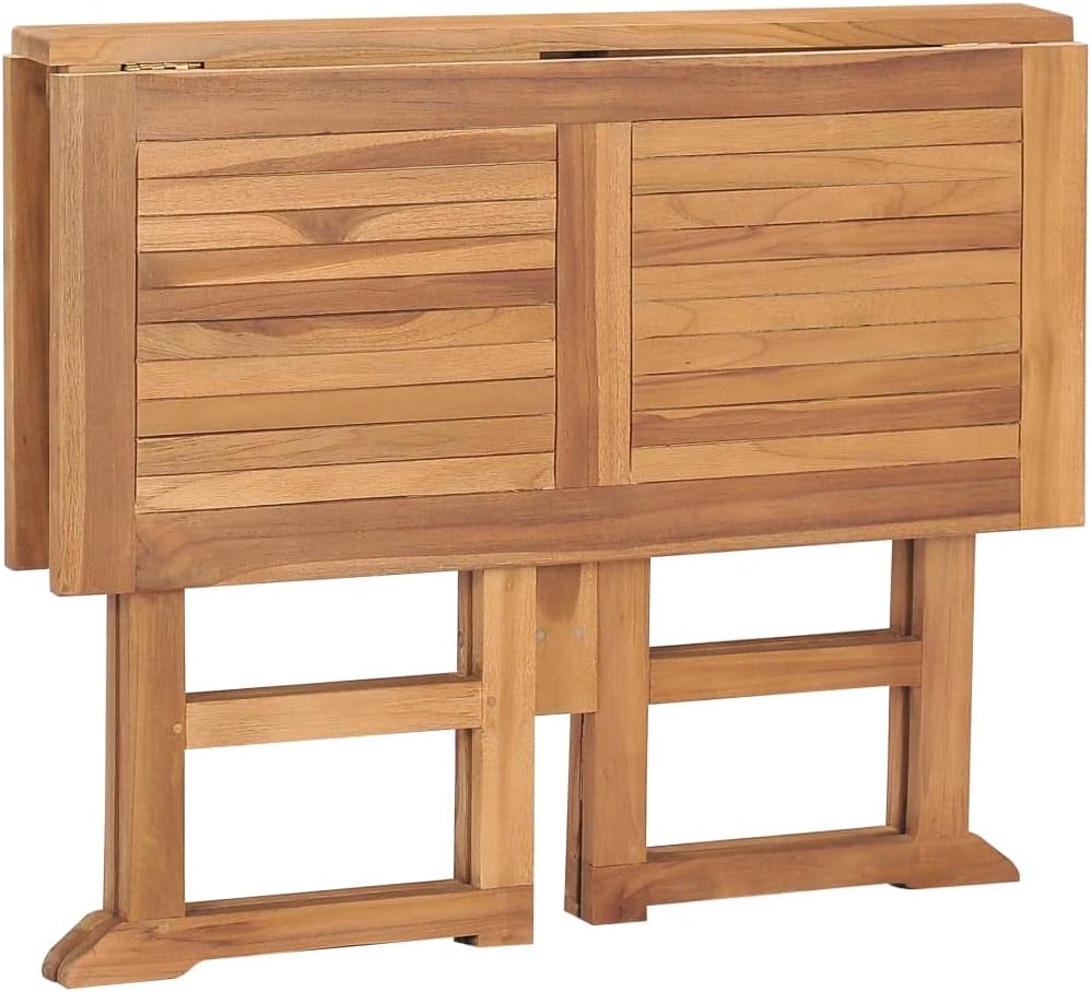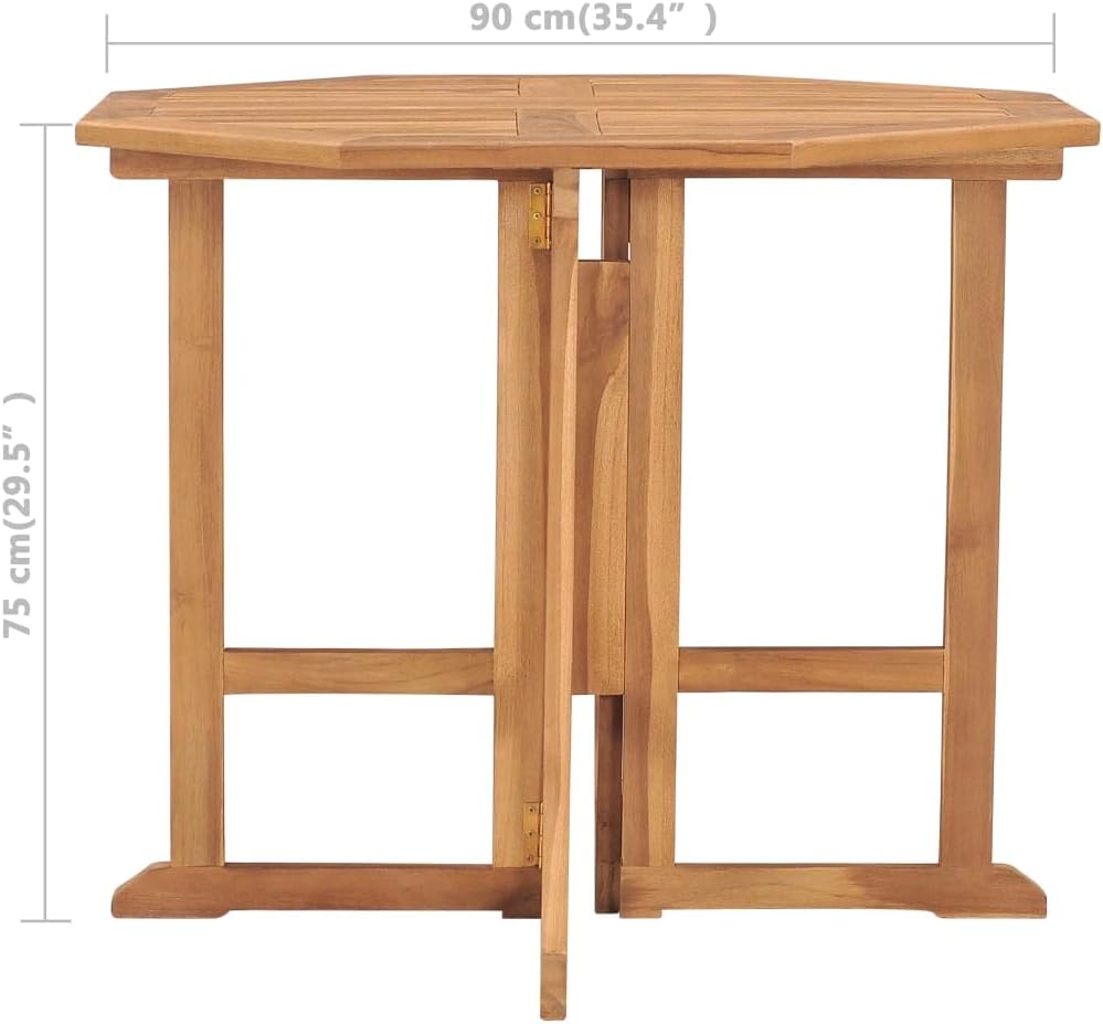 Looking for something more refined and eye-catching for your patio space? This wooden dining table is an optimal choice for you!Constructed from extremely durable teak hard wood, this piece of teak furniture has been seasoned, kiln dried and then fine sanded to give a very smooth appearance. Teak wood is known for its exceptional strength and weather resistance, making it far more suitable for patio furniture than any other kind of wood. Teak wood is the perfect choice if you want to purchase a long lasting piece of patio furniture.Thanks to the folding design, the patio table can be easily folded to save space when not in use.Note: In order to extend the life of your outdoor furniture, we recommend you to clean it regularly and do not leave it outdoors without protection unnecessarily.Clean: Use a mild soap solution.Storing: If possible, store in a cool, dry place indoors. If the product is stored outdoors, protect it with a waterproof cover. Wipe and dry the excess water or snow from flat surfaces after a rain or snowfall. Allow sufficient air circulation to avoid moisture-related damage.Material: Fine sanded teak hard wood with waterbase finishDimensions (unfolded): 35.4" x 35.4" x 29.5" (L x W x H)Dimensions (folded): 35.4" x 29.5" x 5.5" (L x W x H)Tabletop thickness: 0.9"FoldableAssembly required: Yes