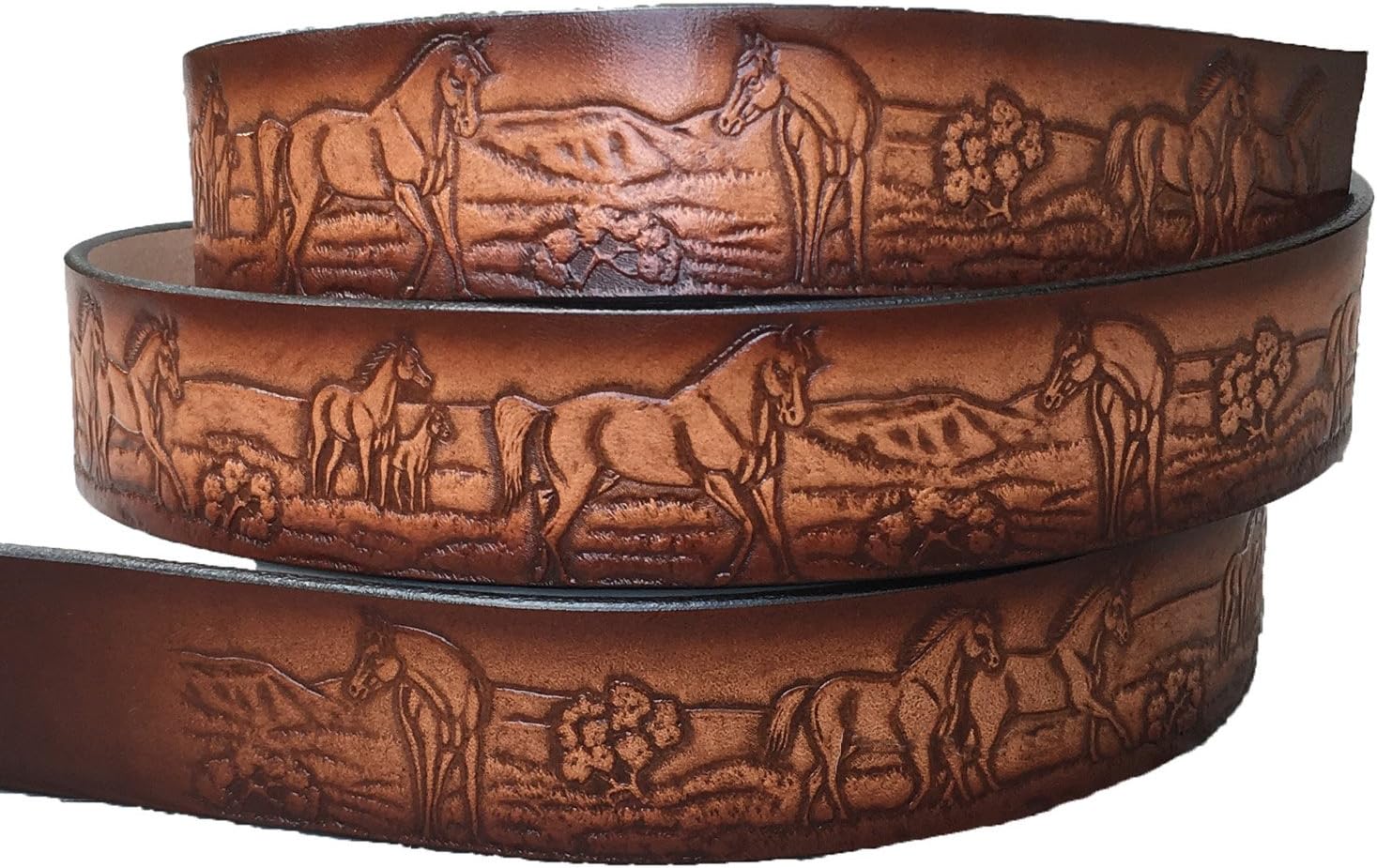 Personalized Custom horse leather name belt. This belt shows horses running and a wooded scene thru the entire length of the belt with a space on the back for a name to be engraved. Belt is 1 1/2 inch wide using the thickest 9/10 OZ cowhide (The best you can use for a belt). We hand finish each belt and use a durable lacquer finish on each belt that will last for years! This is one piece of leather, not pieced or composite leather. Please note: We cut each belt when ordered and all belt makers/manufactures use different methods when ordering belts. We do not accept returns on custom engraved personalized belts, please measure carefully. Measuring guide: Using an existing belt, correct measurement begins from the place where the buckle connects to the belt (do not include buckle) and then to the middle hole. We put 7 holes in belt and the center hole is the length you are ordering. FOR GUYS: A good rule of thumb is your pant size plus 2 inches FOR GIRLS: See guide for help