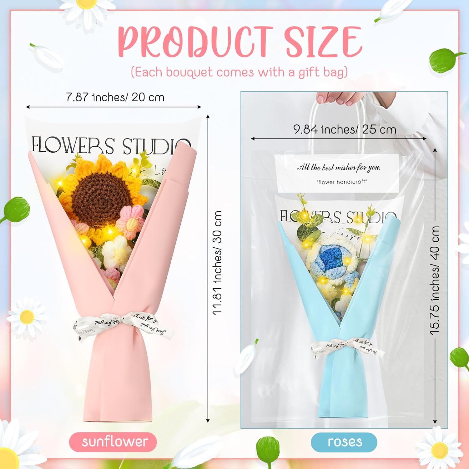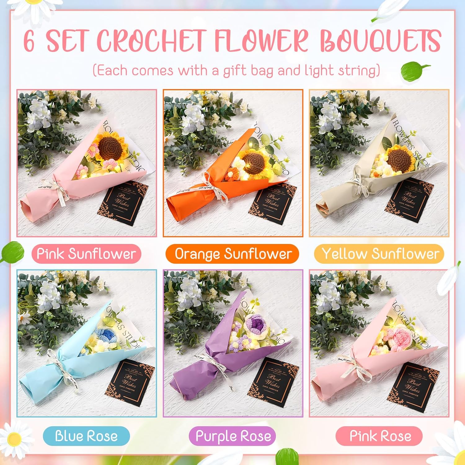 Features: The crochet flower have proper size and portable design, won't take up too much space, and you can carry it to other places easily, will bring you convenience in using. If you have friends who need some flower bouquets in the daily life, you can give them ours, they will like these gifts and feel happy. Specifications: Material: cotton knittingColor: multicolorSize: approx. 11.81 x 7.87 inches/ 30 x 20 cm Package includes: 6 x Crochet flowers bouquetsNotes: Manual measurement, please allow slight errors on size. The color may exist slight difference due to different screen displays.