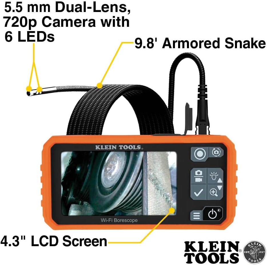 Pro Borescope with dual-lens camera for comprehensive viewing in hard-to-reach areas. Ideal for automotive, plumbing, mechanical, and behind-wall inspections. It comes with a 9.8-Foot (3 m) armored snake, hook, and magnet attachments, and a 5.5 mm waterproof (IP67) camera with adjustable LEDs. It features a 4.3-Inch Color LCD monitor (1920 x1080) resolution, 3 times zoom, and 180-Degree screen view rotation. Transfer photos and video via Klein Tools ET19 App (in the Play Store and App Store). For more than 160 years, Klein Tools has manufactured premium-quality, professional-grade hand tools that deliver the performance, durability and precision needed to get the job done right. Our family of engineers, workers and craftsman continue to put six generations of expertise into every tool we create by using only the highest quality materials, superior workmanship, and keeping manufacturing as close to home as we can. Klein isn't just the name of our company, it's also our family name. And since we're an American company that's family-owned and family-run, you know you can count on us to be here tomorrow. Klein Tools doesn't just make great products, we make great products that stand up to the demands of the professionals who use them every day ... Since 1857.