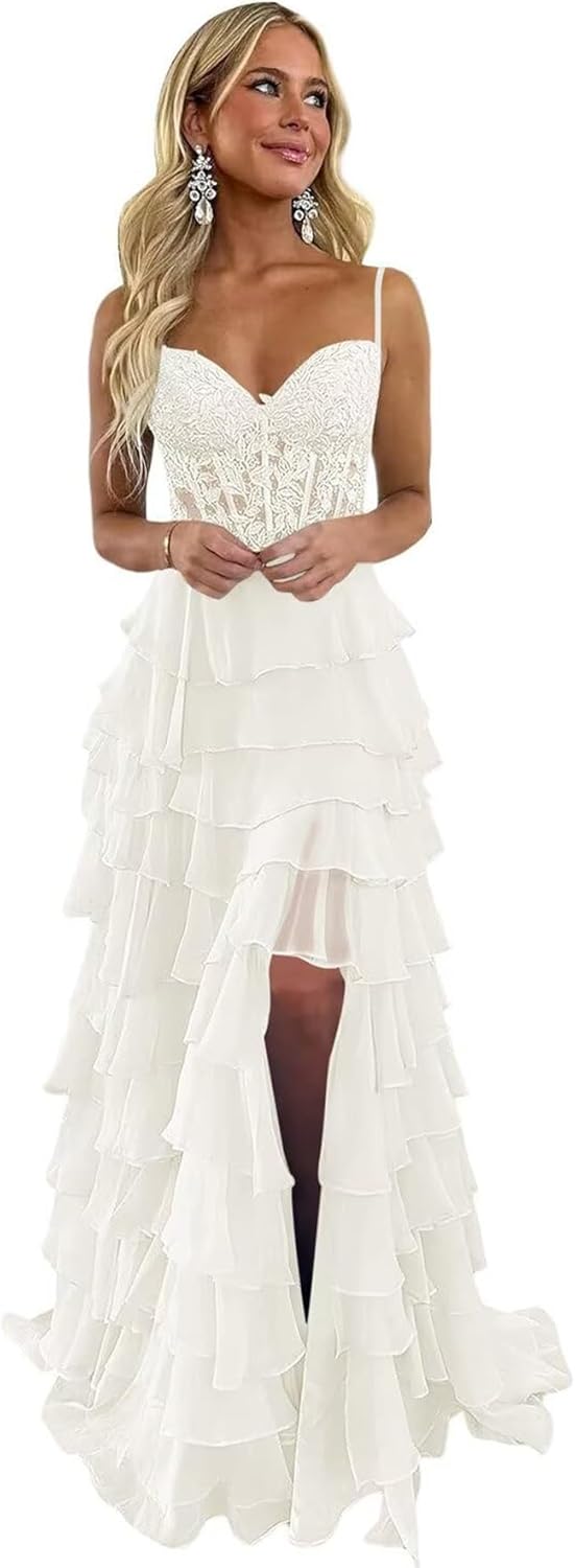 | Fabric Type | Lace Appliques Tiered Chiffon Spaghetti Strap Corset Ruffle Prom Dresses with Slit 2025 |