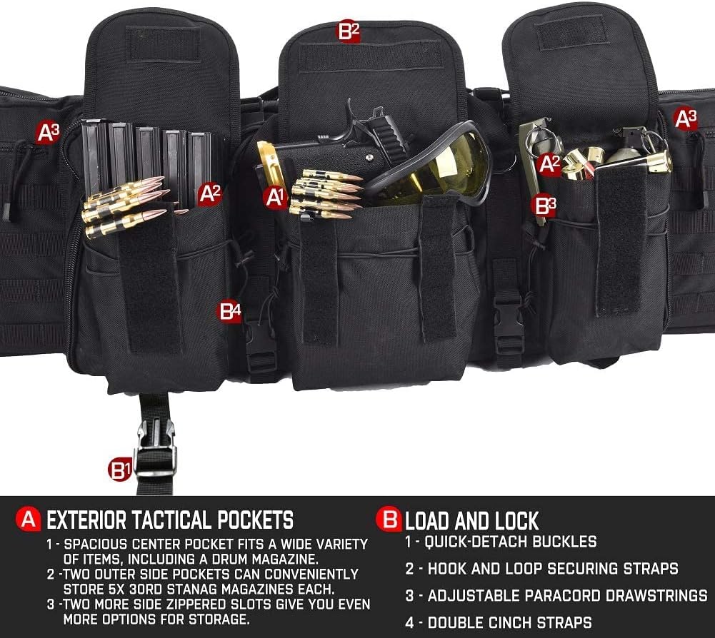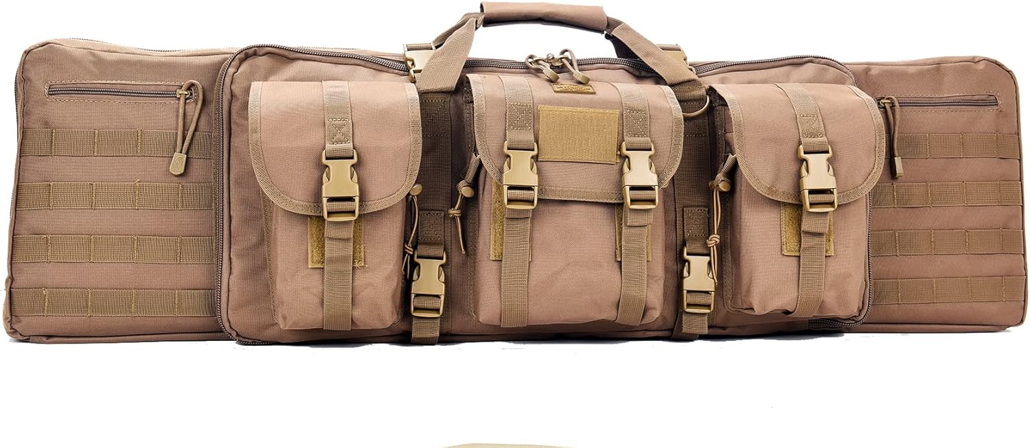 Features: - Quality woven 600 Denier Polyester provides an enhanced tensile strength double carbine rifle soft bag that proves to hold up well in extreme conditions and against tears, rips or fraying. Four lines of MOLLE webbing are on each side of the soft bag for additional attachment of pouches and other tactical accessories. - Lancer Tactical's Double Gun Bag's main compartment to easily fit two of your favorite rifle carbines held down by protective sleeves and elastic bands that assist in holding down your rifle and mitigating any unwanted movement during transit. An EVA foam brace surround the main compartment to provide additional support while an EVA foam divider prevents abrasion by separating and providing padding between rifles. A Secondary compartment can also fit a Carbine with a maximum length of 25" in. - Multiple forward acessory pouches can be found with bungee fastening. Second pouch cover includes two zippiered inner compartments while the base includes two velcro closure inner compartments. The Quick Detach buckle system is wholly adjustable and is perfect for those looking to tightly secure their belongings and gear. - Double velcro straps secure items on top and bottom of bag and for those looking to trek and carry their gear in a more ergonomical way, there are removable padded backpack straps in the rear of the bag that detach via D-rings so you can comfortably distribute weight among your shoulders and back. There's also a padded carrying handle at the top of the bag to carry your soft case traditionally. - Included Back strap also have an accompanying chest strap for increased stability and to ensure your bag stays where it needs to even during quick movement.Specifications: Material: 600 Denier PolyesterDimensions: 42" x 15" in. x 4" in. Weight: 6.2 lbs