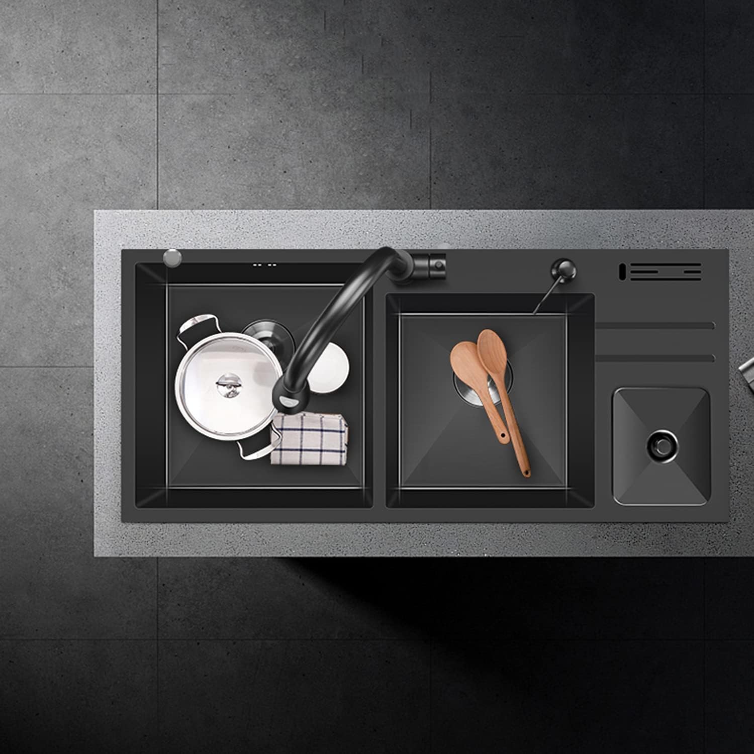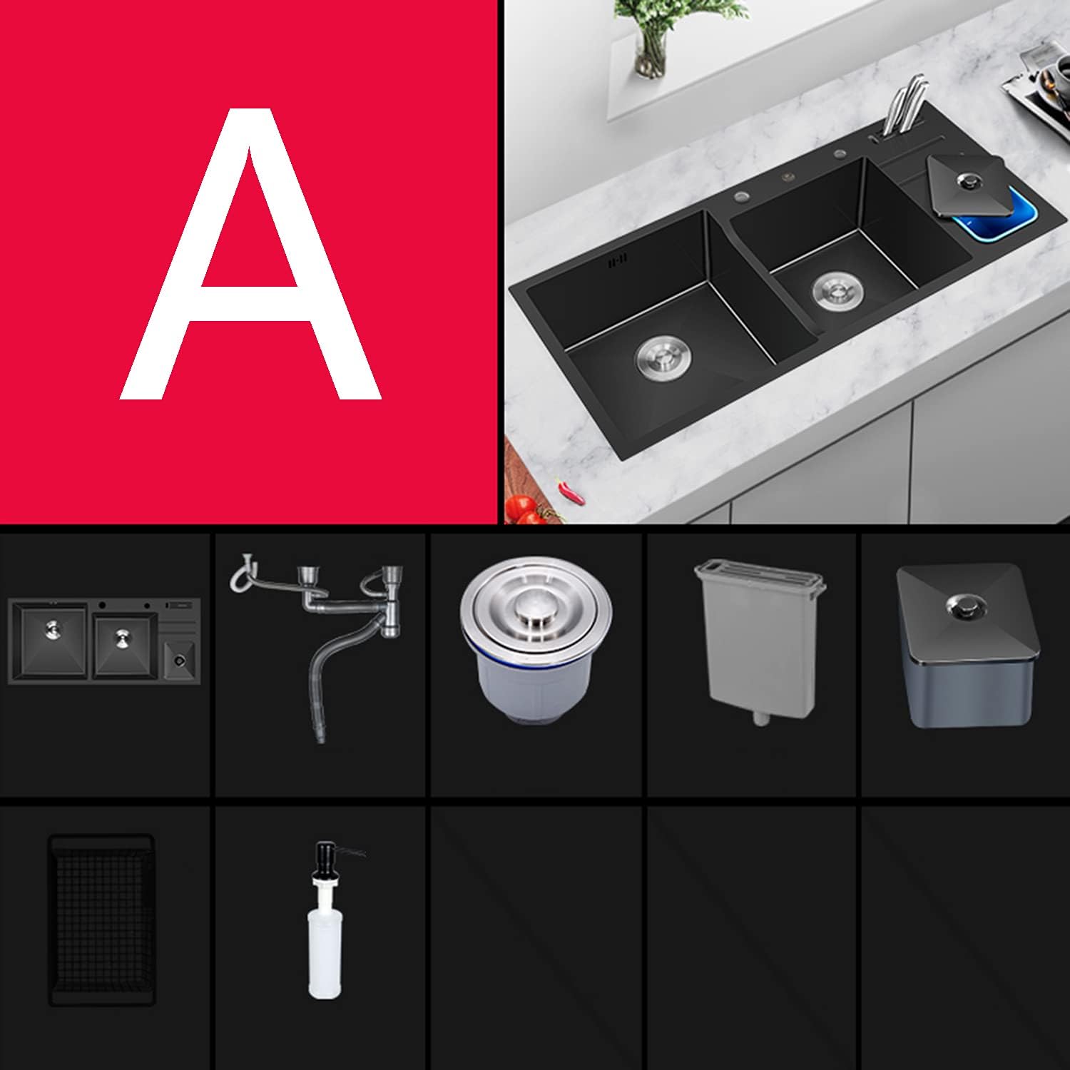 Kitchen sink, made of SUS304 stainless steel, brushed surface, smooth, easy to clean, smooth corners and hand-polished edges, sink with freezer plate, can be used to quickly defrost frozen food, at the same time with embedded knife holder, hidden cover Trash cans can be used in kitchens, balconies, garages, RVs, workbenches, etc. Product name: kitchen sink Material: 304 stainless steel Applicable scenarios: kitchen, balcony, garage, workbench Shape: rectangle Colour: Black Size: 100*45*24cm (39.4*17.7*9.4 inches) Packing: A-sink, drainage set, grid basket, knife holder, trash can, B-sink, drain set, grid basket, knife holder, trash can, faucet, inlet pipe, angle valve. Precautions We only sell sinks (please check the pictures for detailed accessories), and the rest are props. We have many similar products, please click to enter our store, we will show better works.