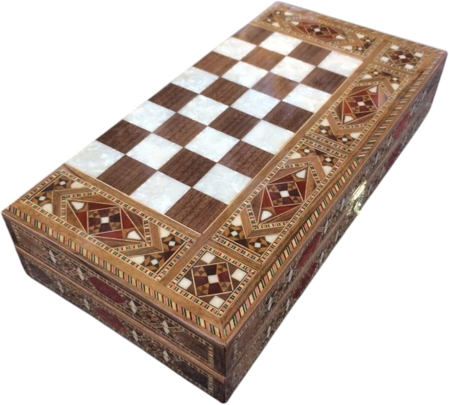 classic wood backgammon set with walnut inlay when closed Solid wood frame - Includes high-quality playing pieces Elegant style and quality craftmanship (Brown color) Easy to carry and store - Perfect for travel, tournaments, indoor, outdoors, and family fun...... folding wood backgammon set is a classic! Featuring an elegant design and solid wood frame, this backgammon set delivers quality, style, and beautiful craftsmanship. Since this backgammon set emphasizes sleek styling, it is most suitable for at home play, and is a beautiful addition to the finest game room.