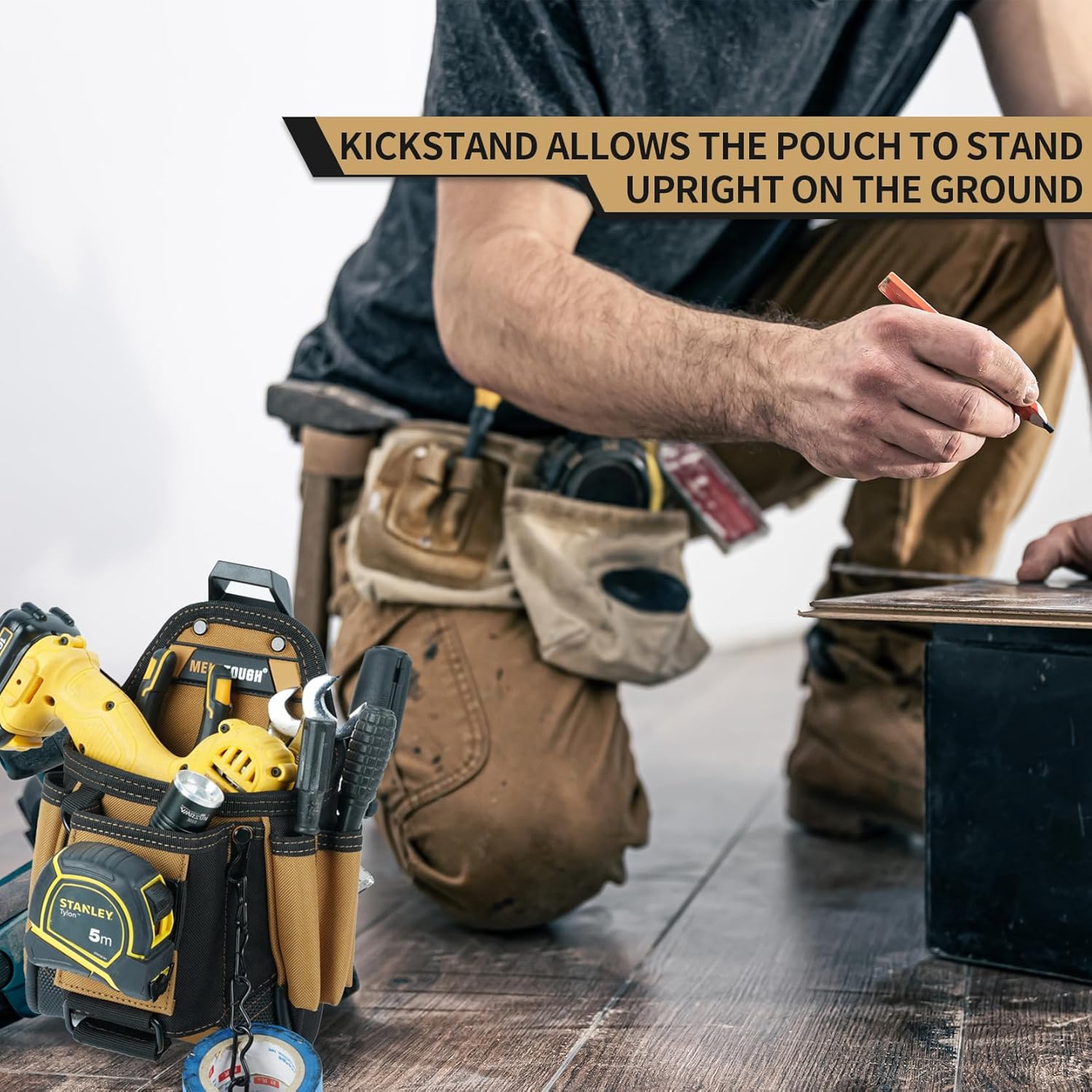 MELOTOUGH Small Electrician Tool Pouch Tool Belt Pouch with Belt Clip Attachment 9 Pockets Tradesman Tool Bag Pouch with Tape Thong Electrician Tool Holster(Khaki) + MELOTOUGH Work Knee Pads for Men Women Construction, Flooring, Roofing - Comfortable and Non Slip(Black)