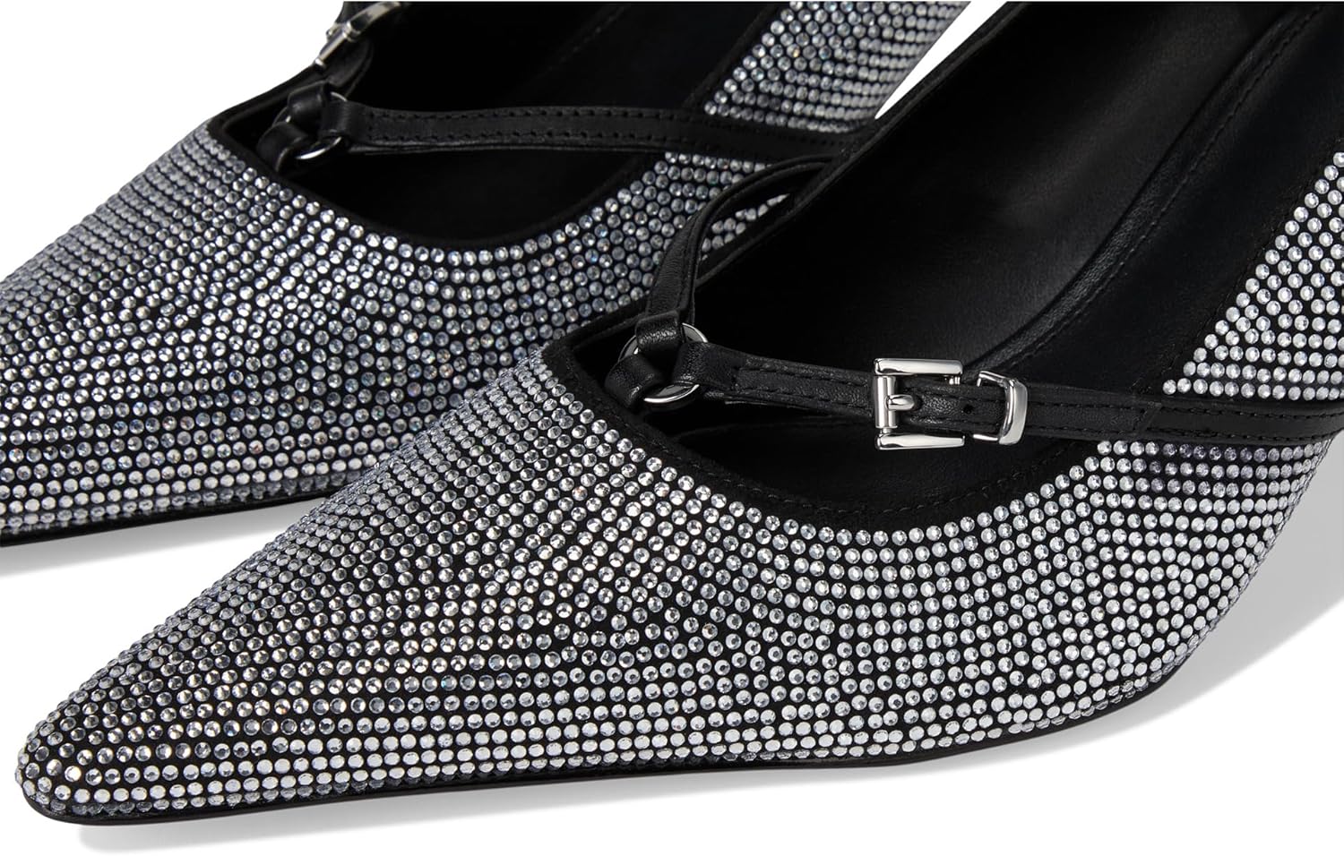 Fashion pump defined by its strappy harness-inspired upper accented with dainty rings that brings an edgy touch, elevated by a sculptural stiletto heel.