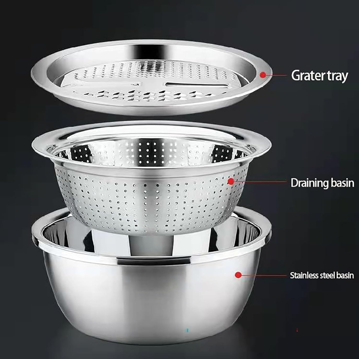 Introducing the ultimate kitchen companion: our multifunctional stainless steel basin set. This versatile three-piece collection combines a solid basin, a colander, and a grating and slicing bowl, designed to streamline your food prep and cleanup. Available in two practical sizes (10.24in and 11.03in), it offers the perfect fit for any kitchen task.Experience the efficiency of the stainless steel grater with bowl, allowing you to grate cheese, slice vegetables, and more directly into the container. The stainless steel grating bowl features sharp, precision-cut blades for consistent results every time. Its companion colander ensures quick and thorough draining, while the solid basin catches all liquids and scraps.The genius lies in the stackable design. Use the colander or grating bowl on top of the solid basin to prevent countertop mess and water pooling. This integrated system keeps your workspace clean and organized. Crafted from high-quality stainless steel, these bowls are built for everyday use and easy cleaning.Simplify your cooking routine with this all-in-one set. From washing and draining to grating and mixing, it handles multiple steps with fewer dishes. Your complete kitchen solution awaits.Package Includes: 1 x Solid Stainless Steel Basin, 1 x Colander (Drain Bowl), 1 x Grating and Slicing Bowl.