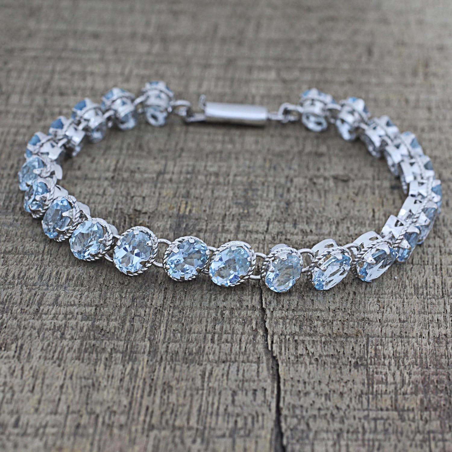 Novica works together with talented artists, artisans, and designers around the world to produce stunning, keepsake handmade treasures. Our mantra is to Spread Happiness, so rest assured - we’ll do everything we possibly can to ensure you’re a happy customer!About this item: Sparkling topaz stones, The December´s birthstones, flow like blue water in a serene circlet. Set in a sterling silver bracelet, the gems (approximately 25 carats) form a fluid design from Alok Jain. .925 Sterling silverAbout our Artist: 'I'm inspired by nature, hence you will find that most of my designs feature natural motifs. The highlight of my journey into handicrafts came in 1995, when the Sultan of Brunei placed an order for my designs'...