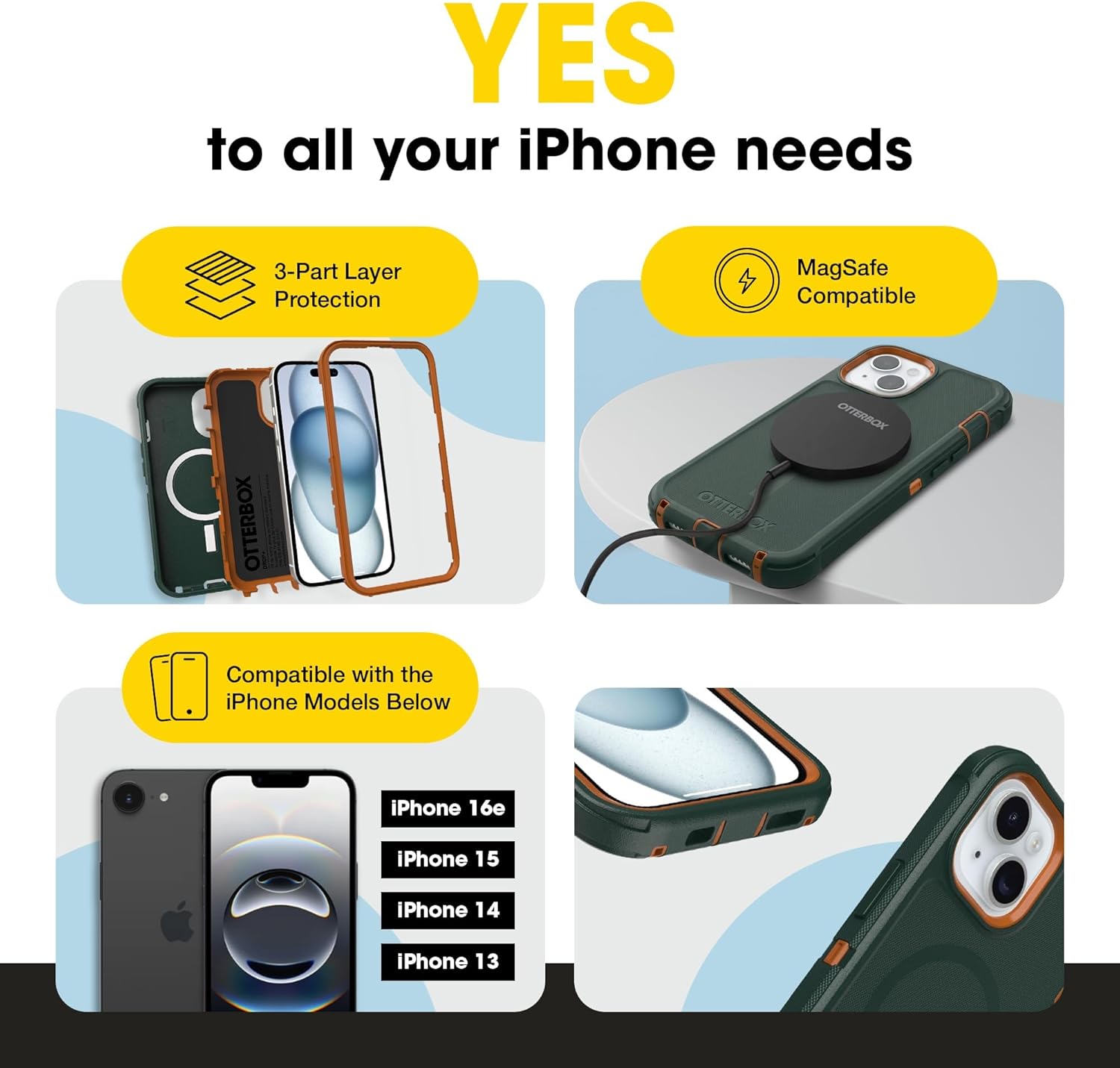 OTTERBOX DEFENDER SERIES CASE (MADE FOR MAGSAFE) FOR IPHONE 16e, IPHONE 15, IPHONE 14 AND IPHONE 13 (NOT COMPATIBLE WITH PLUS, PRO MODELS) For 7X military standard drop defenses, go with Defender Series Pro for MagSafe, our toughest iPhone 16e, iPhone 15, iPhone 14 and iPhone 13 case yet. It's equipped with corners that absorb shock, all-over texturing for greater grip, integrated MagSafe magnets and built-in anchors for connecting phone straps. FEATURES:Tri-layer defense with a silicone cover to resist bumps, rigid inner shell to hold your phone in place and a memory-foam backing for stabilityAll-over texture delivers greater grip that helps prevents drops before they happenPort covers block dust and dirtTextured sides for a secure grip you won’t drop easilyBuilt-in magnets support wireless charging and MagSafe accessoriesRedesigned corners are reinforced to deliver added cushioning and easier pocketingBuilt-in anchors let you connect phone straps to prevent dropsScreen lip keeps display hovering safely off surfacesBuilt-in magnets support wireless charging and MagSafe accessoriesWorks with OtterBox screen protectorsLimited lifetime warranty and hassle-free customer serviceSlim profile slips easily in and out of pockets WHAT'S IN THE BOX: OtterBox Defender Pro Series MagSafe Edition Case COMPATIBILITY: iPhone 15iPhone 14iPhone 13iPhone 16e DROP RATE: DROP+ | 7X as many drops as military standard (MIL-STD-810G 516.6) MATERIALS: Thermoplastic Elastomer slipcoverPolycarbonate LayerMagSafe WARRANTY: OtterBox limited lifetime warranty (see website for details). PACKAGING: Non-Retail Packaging.
