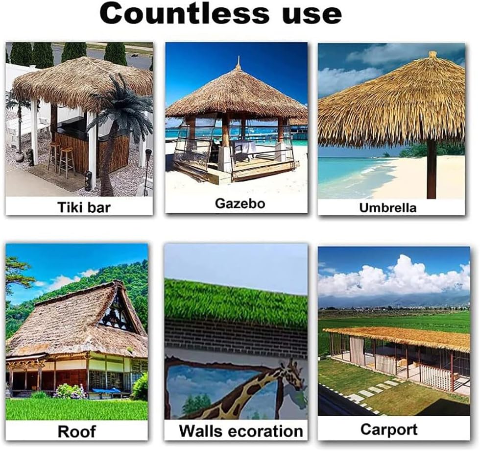 Product Specifications:Product Name: Simulation ThatchProduct material:PVC、PEProduct size:The size of each piece is 0.5x1m(1.64x3.28ft), It takes about 3m per square meter,Fast laying and labor saving.Product use: Park view resort/hotel seaside pavilion/restaurant decoration, etc.Plastic simulation thatch details:1. BuildProfessional and technical craftsmen create different standards, support custom-made, flexible, convenient, fast and easy-to-maintain construction and installation.2. High durableflame retardant, weather resistance ,and the color is lasting and stable,has high stain resistance, easy to clean and maintain.3. Anti-stress and practicalGood manufacturability, made of fine materials, can withstand the harsh environment, can be recycled and reused, energy-saving and environmentally friendly.☄Installation method:One: Plate bindingThe roof should be waterproofed first, and the board should be laid on the waterproof layer, and then the thatch should be nailed to the board piece by piece;Two: wood board bindingMake a wooden shelf on the waterproof roof, and then install the thatch nails on the woodThree: Bundled installationSpread the plastic steel net on the waterproof roof, and then tie the thatch to the plastic steel net.