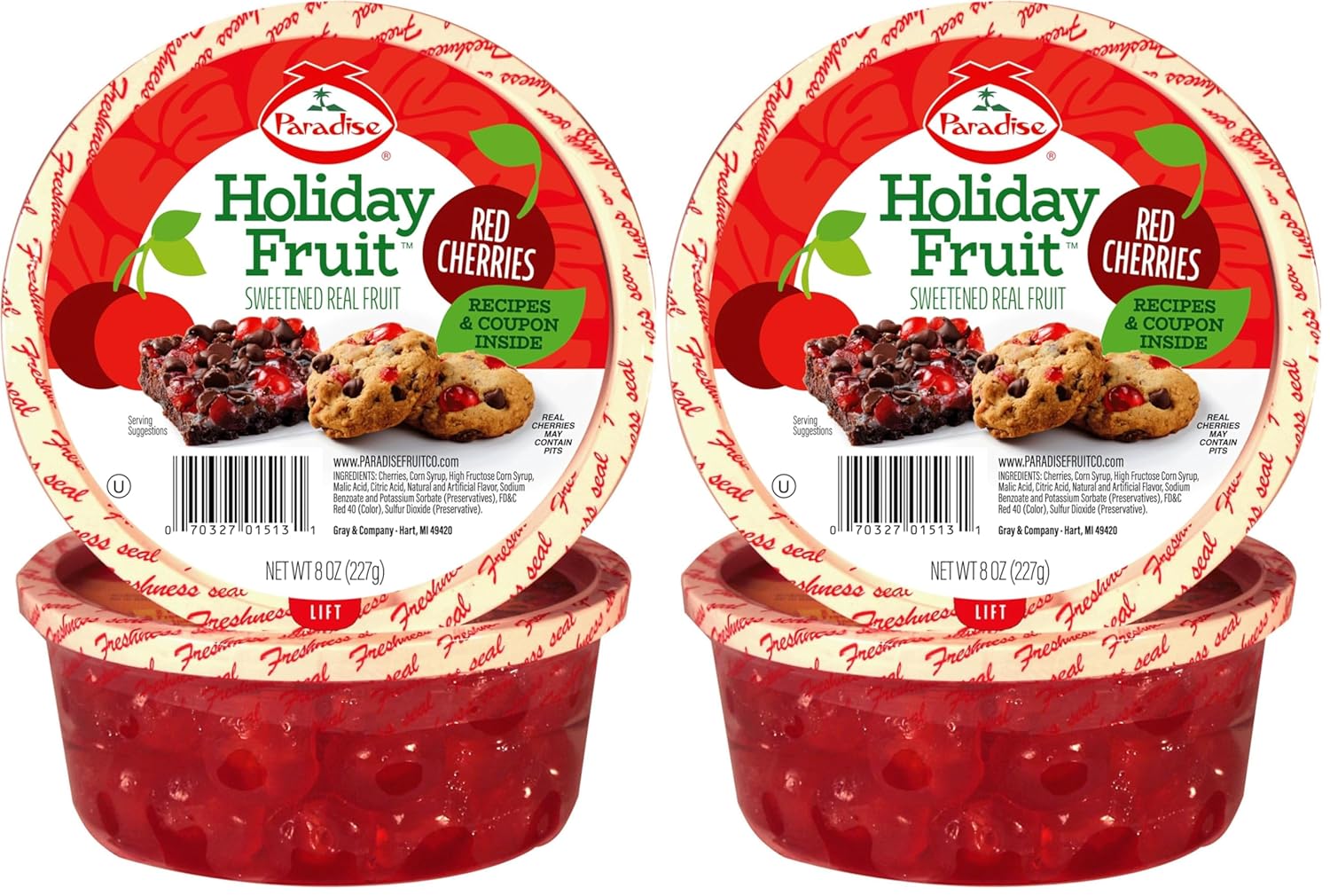 Noted for their vibrant color, perfect sweetness and rich, chewy texture, Paradise Red Candied Cherries-also known as glace red cherries--are a delicious addition to a variety of traditional and new candied recipe ideas. Whether you are making a classic holiday fruitcake or festive cherry chocolate chip cookies, you are making the best for your friends and family with Paradise red candied cherries. We have a number of delectable and fun recipes that utilize these sweet treats including: Cherry Brownies, Cherry-Citron Cake, Cherry Pineapple Cake, Fruit Cake, Oatmeal Cherry Pineapple Cookies, Reindeer Ornament Cookies, Cherry-Chocolate Bars, Cherry-Pineapple Crispies and a Yuletide Centerpiece Tree.