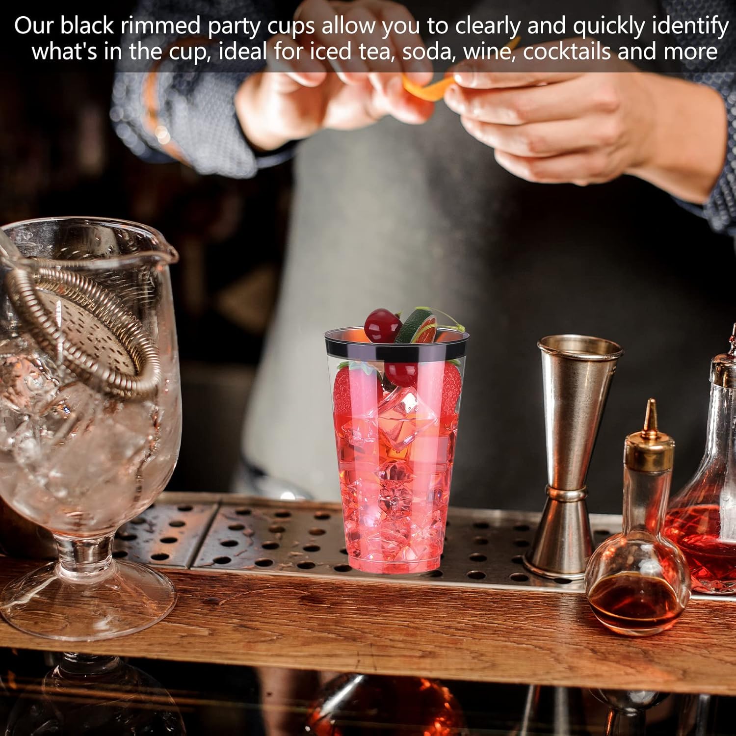 Features: Introducing quality 16oz Clear Plastic Cups with black rim, Elevate your events with these disposable tumblers, crafted for those who seek both style and convenience. Featuring a crystal clear design and a striking black border, they add a sophisticated touch to weddings, parties, and holidays 16oz black rimmed cups are designed to make every occasion special, from black themed weddings to casual family dinners. Their leak resistant and sturdy build ensures there is no spillage when drinking, while the disposable nature means effortless cleanup Specifications: Material: plastic Size: Black rim: about 3.27 inches/ 8.3 cm Bottom: about 2.05 inches/ 5.2 cm Cup height: about 5.31 inches/ 13.5 cm Capacity: about 16 ounces Package includes: 100 x Black rimmed plastic cups Notes: Manual measurement, please allow slight errors on size. The color may exist a slight difference due to different screen displays