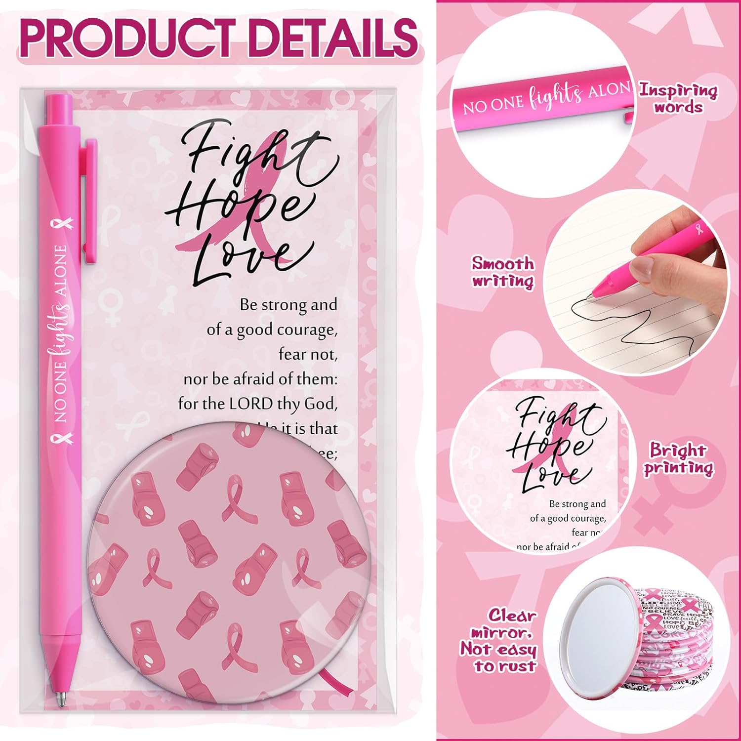 Features: The breast cancer awareness slogans printed on the cards are a warm reminder to patients, encouraging them to fight the disease with hope, optimism and courage. The breast cancer accessories are exquisitely designed and suitable as souvenirs to those who participate in the awareness campaign to express your care and support. Specifications: Material: paper, plastic Color: pink Size: Compact makeup mirror: 2.48 x 2.76 inches/ 6.3 x 7.0 cm Ballpoint pen: 5.67 inches/ 14.5 cm Motivational card: 3.15 x 5.12 inches/ 8 x 13 cm OPP bag: 3.54 x 6.3 inches/ 8.99 x 16 cm Package includes: 100 x Compact makeup mirror 100 x Ballpoint pen 100 x Motivational card 100 x OPP bag Notes: Manual measurement, please allow slight errors on size. The color may exist a slight difference due to different screen displays