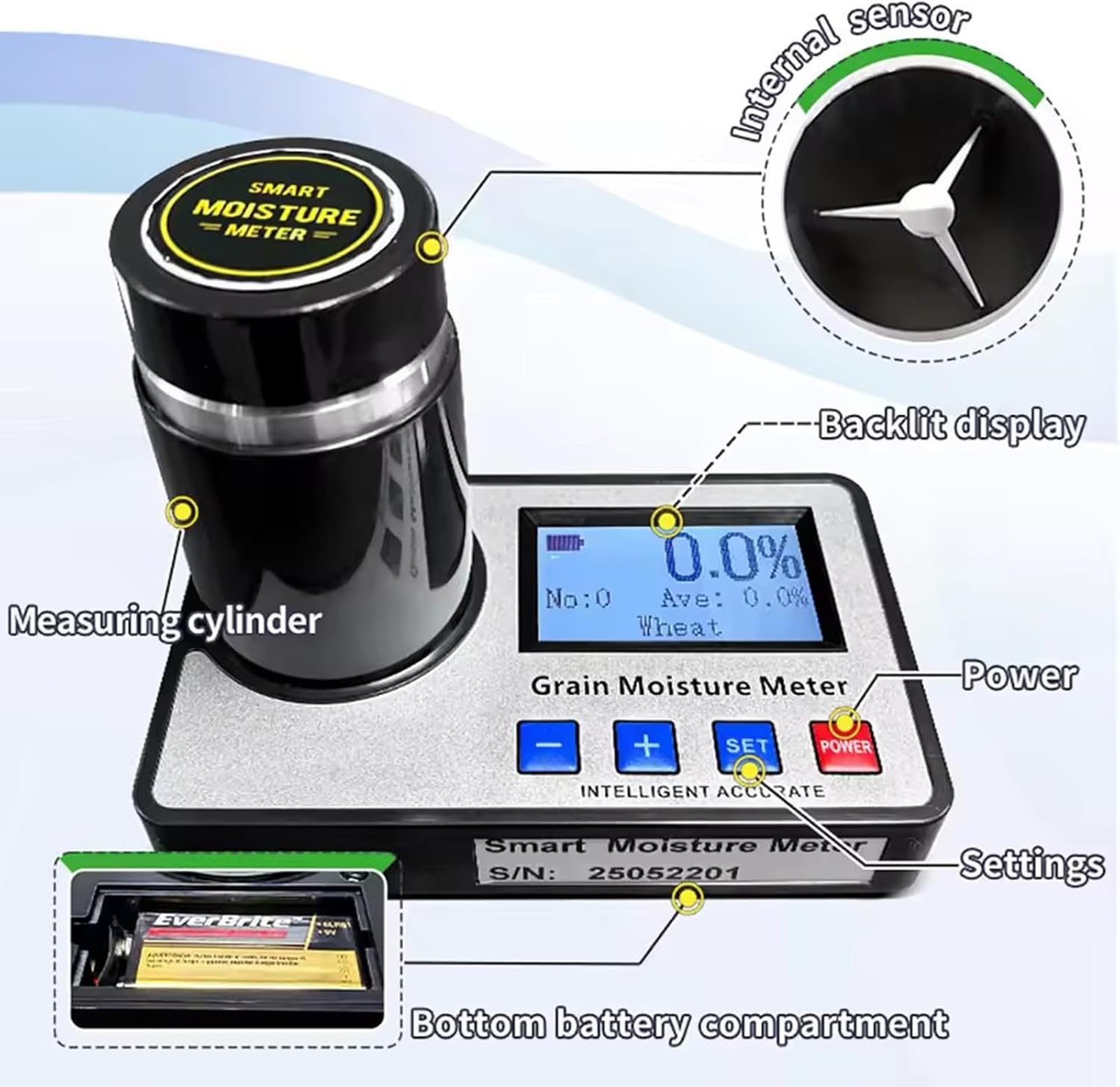 AMT155 Smart Grain Moisture Meter is a new designed portable moisture test meter, it can test 19 kinds grains moisture with fast reading, easy operation, pocket size and easy to carry. Applications: Wheat, Maize, Japonica rice, Indica rice, Soybean, Rice,Sorghum, Rapeseed, Millet, Peanut, Barley, Sunflower seed, Coffee bean, Cocoa bean, Sesame, Flaxseed, Almonds, Cashews,Parchment Coffee.Specification:NameL: Grain Moisture Tester Measuring Range: 8~30%Accuracy: 0.5%Adjust Range: -9.9% ~ +9.9%Repeat Error: 0.2%Working Temperature: 0~ 40℃Automatic Temperature CompensationBattery: 9V (6F22)--Not IncludedAuto off: 3 minutesPackage List:1 X Grain Moisture Meter1 X Storage Bag1 X User ManualOperation:1. Press power key to turn meter on.2. Press Set key, LCD will display “Select kind” 、“Adjust moisture”、“Backlight Switch” and “Select Language”.In “Select kind” menu, press set again, then it will display the 19 kinds of grains,press + or - to choose the right tested grains, press SET again to keep it, LCD will back to measuring mode. Select LanguagePress SET key,press + or - to choose“Select Language”,press the SET key again to enter the language selection interface.Press + or - to choose Chinese or English,press SET again to keep it, LCD will back to measuring mode.