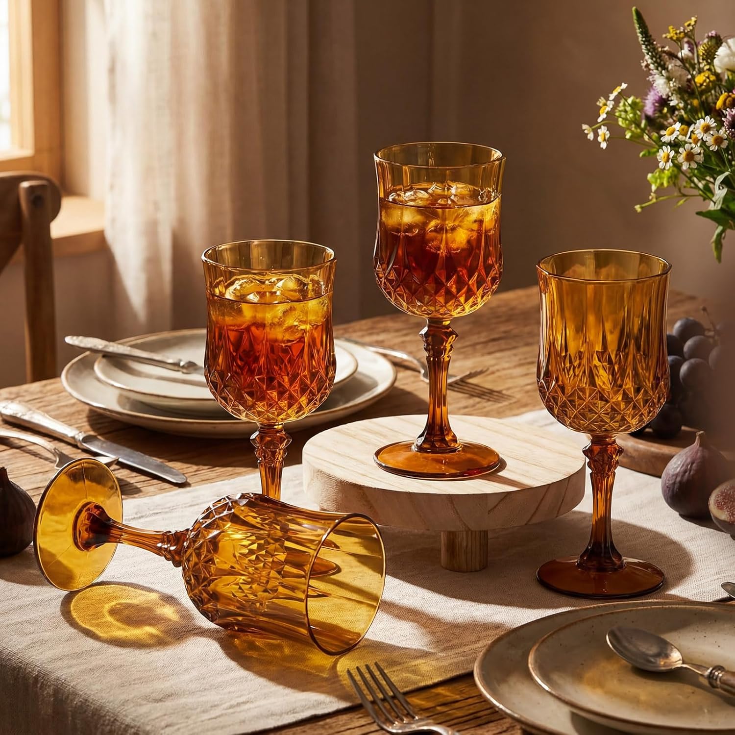 Features: Crystal-like design: featuring a vintage diamond pattern and crystal-textured finish, these amber wine glasses beautifully showcase the color and shine of your beverages. Their sophisticated design mimics the look of real crystal, providing a luxurious visual experience for you and your guests. Versatile use for any occasion: these amber plastic wine glasses are suitable for champagne, wine, cocktails, juice, and other beverages. Use them at weddings, baby shower, anniversaries, birthdays, housewarmings, family gatherings, or daily meals for a touch of elegance without the worry of breakage. Specifications: Material: plastic Color: amber Size: about 6.7 inches tall with a 2.75 inch diameter Capacity: 8oz Package includes: 24 x Amber wine glasses Notes: Manual measurement, please allow slight errors on size. The color may exist a slight difference due to different screen displays