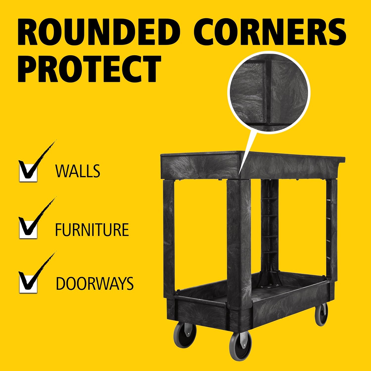 The Rubbermaid Commercial Utility Cart with 2 Lipped shelves, Medium, is constructed of sturdy structural foam that will not dent, chip, or peel. Deep, lipped shelves help keep up to 500 lbs. of materials secure when the cart is rolling, so tools and supplies won't slip or slide off. Crafted with rounded corners to protect walls and furniture, this rolling cart has 5" non-marking swivel casters for lightweight maneuverability. With handle compartments for additional storage, molded fittings for rolled supplies, an easy-access lipped bottom shelf, and a lipped top shelf, this is a versatile and indispensable utility cart for any facility.