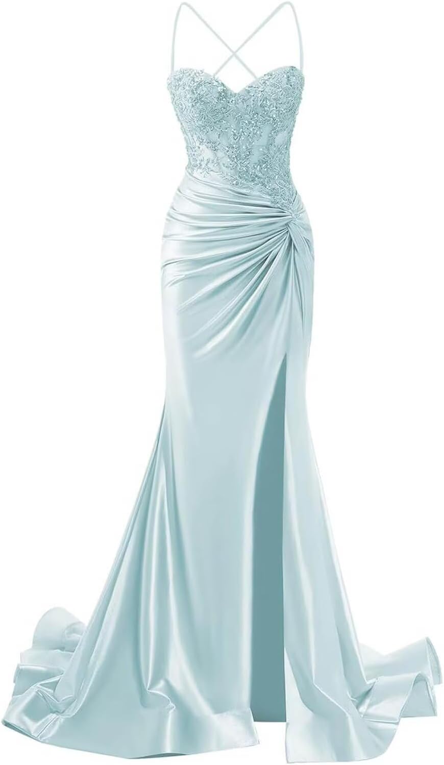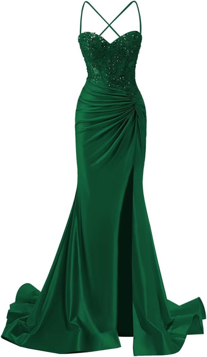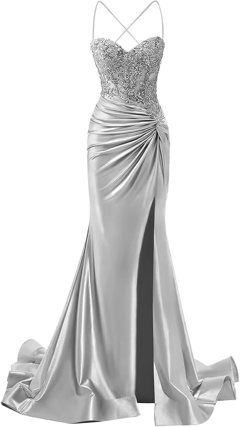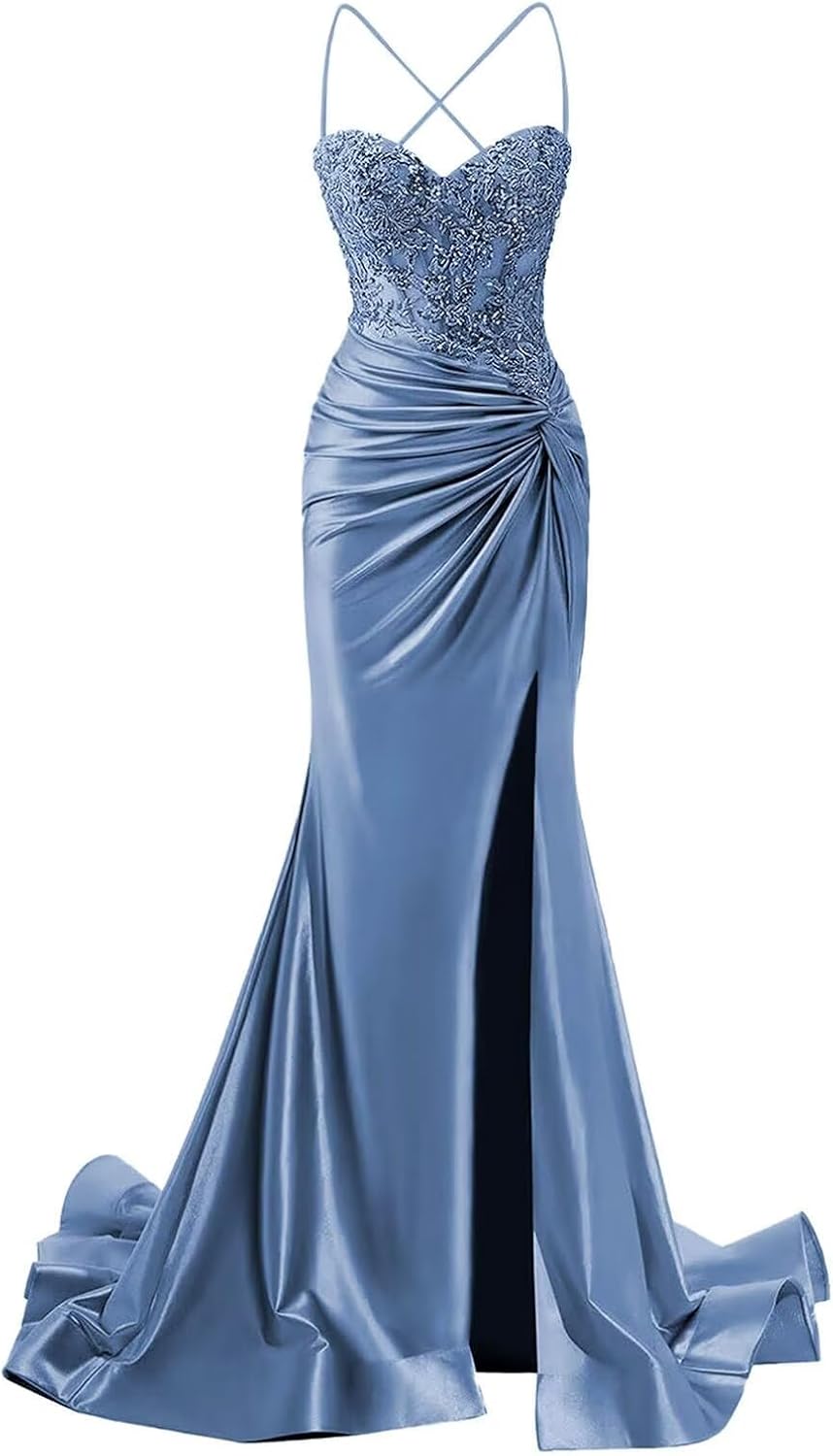 Welcome to XsqmbwbWe wish you to be able to choose a beautiful dress that suits you.We will provide you with bridesmaid dress,evening dress,prom dress,homecoming dress,cocktail dress,wedding dress.the business philosophy of our store is to provide customers with satisfactory products and services,to become customers' friends,not just for sellersDress DetailFabric:Satin Feature:Spaghetti Strap Prom Dress for Women Long 2025Ruched Satin Mermaid Formal Gowns with TrainLace Appliques Sweetheart Prom Dresses with SlitLace Up ClosureSpaghetti Strap,with Slit,Lace Appliques,with Train,Mermaid,Sweetheart,Ruched,Corset,Sleeveless,Ruched Satin Mermaid Prom Dresses with SlitHow to choose size:Please refer to the size chart on the left side of the product page to select a size,pay attention! ! ! if you are not sure which size to choose,you can choose One Size,One Size in our store represents customized size,if you need to customize, please send us your measurement details as list:1.Full Bust _____ inch or ___ cm2.Waist _____ inch or ___ cm3.Hips _____ inch or ___ cm4.Shoulder to Shoulder ____ inch or ___ cm5.Hollow to floor (Shoulder to Feet without shoes) ___ inch or ___ cm6.The height of heel shoes: _____inch or ___ cm7.The date you need the dress:____Notes:1.Due to the difference of the display, please allow a slight color difference between the received dress and the picture2.Please allow 1-3cm differs due to manual measurement.