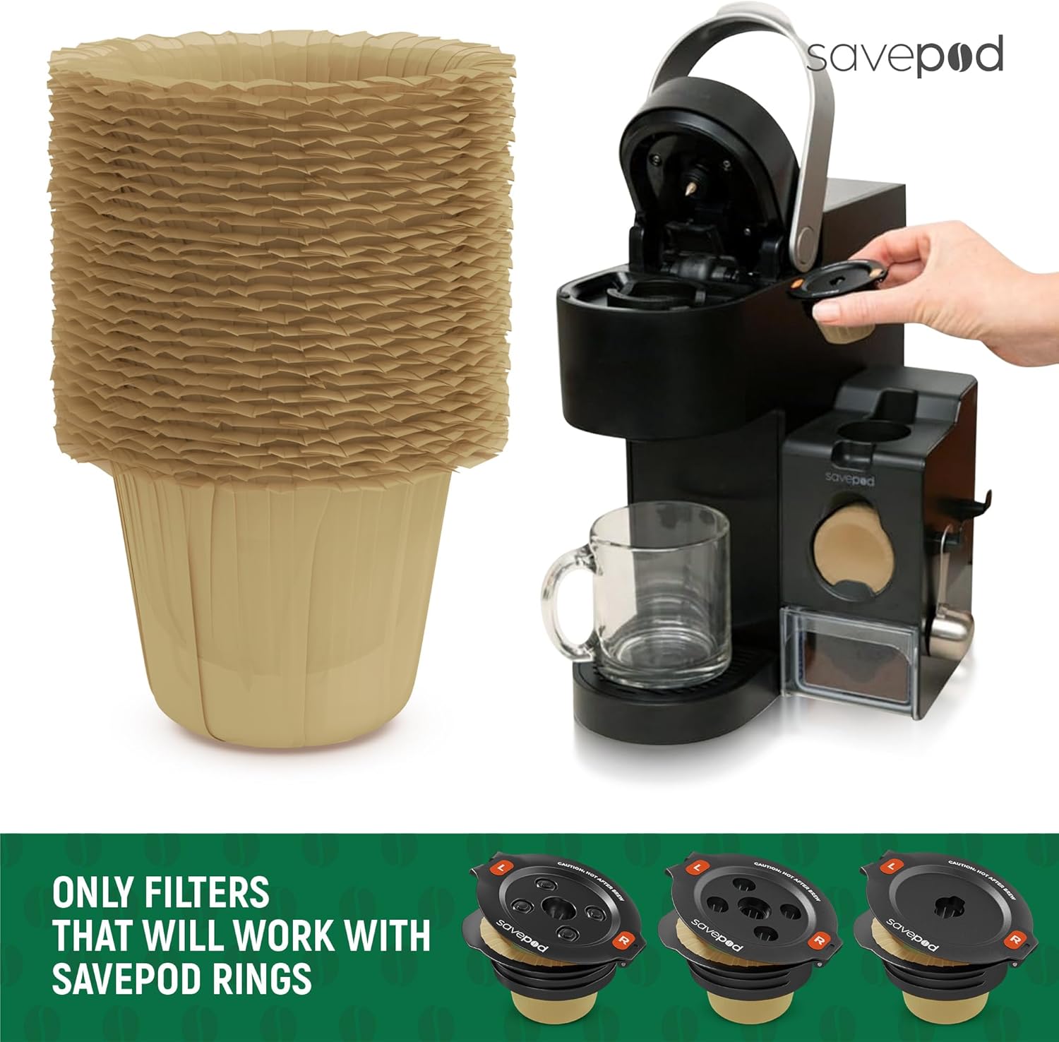 These paper coffee filters are designed for use with the Savepod Coffee Pod Maker. Simply fill a filter with your favorite ground coffee, brew, and dispose of the used grounds with ease by opening the reusable Savepod ring that secures each filter. This innovative system offers a convenient alternative to traditional single-use and reusable pods. Made from paper-based, plastic-free materials, these filters deliver great-tasting coffee while supporting cleaner, simpler brewing and faster cleanup. Includes 300 small filters for single-serve use. Disclaimer: Keurig and K-Cup are registered trademarks of Keurig Green Mountain, Inc. Savepod is not affiliated with or endorsed by Keurig