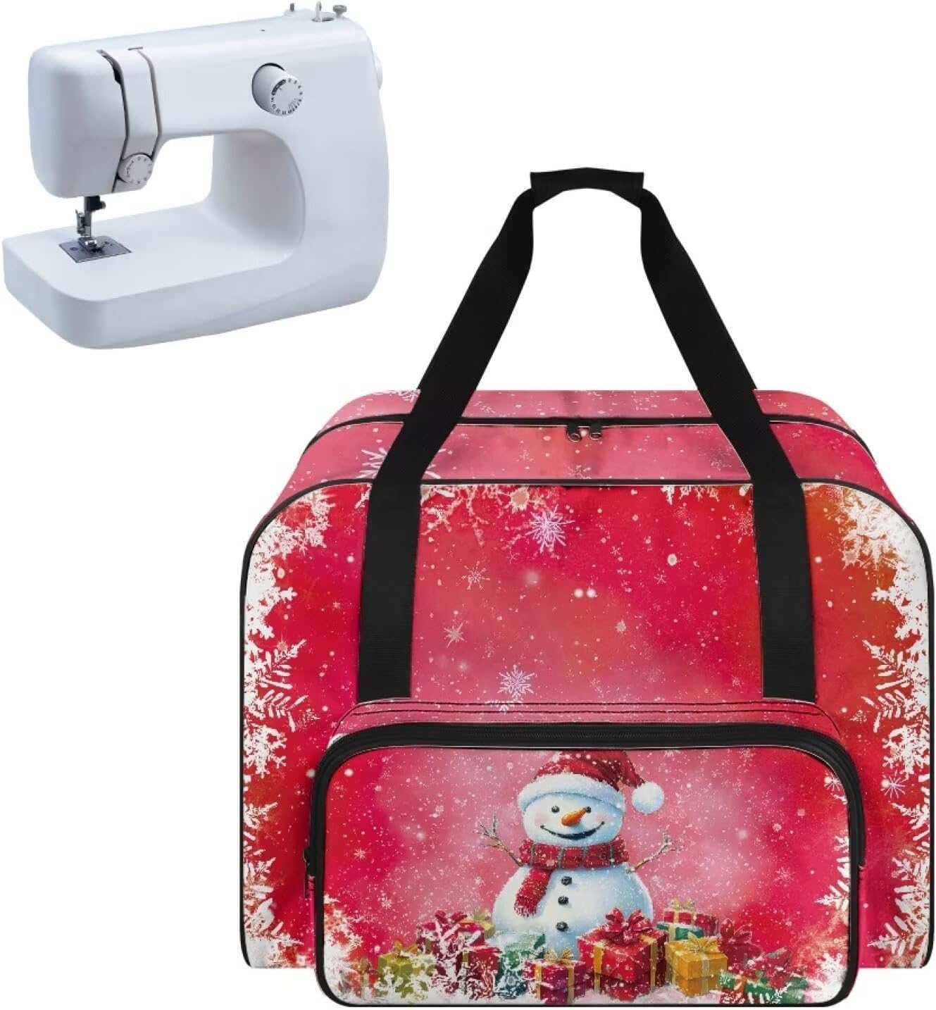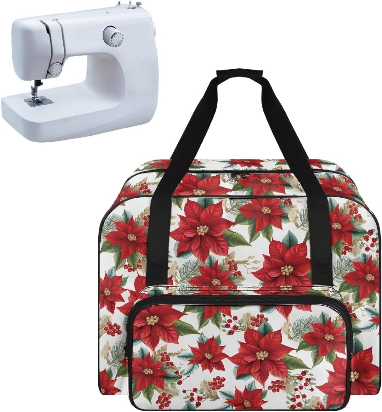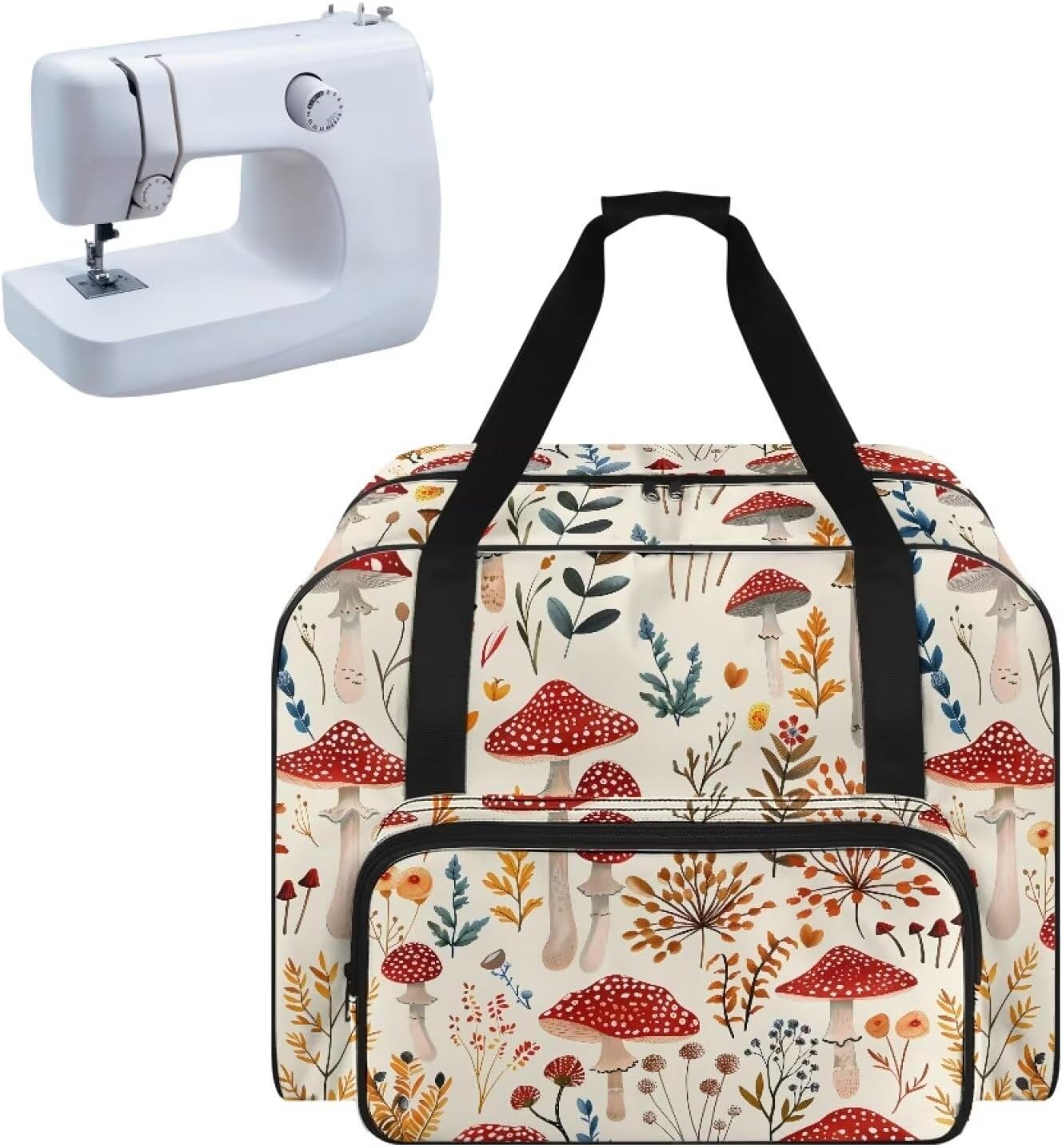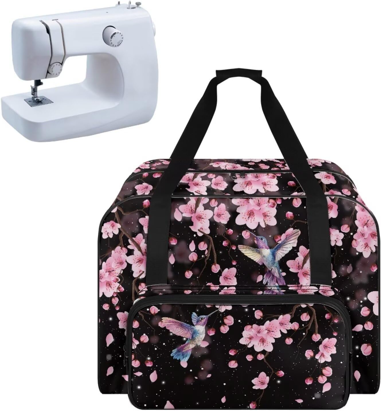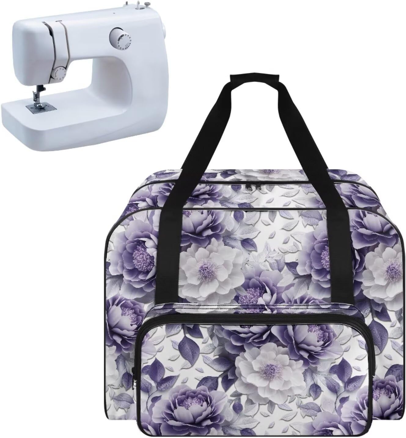 Premium Sewing Machine Travel Bag with Generous Storage Space Keep your sewing machine and accessories organized and protected with our high-quality sewing machine bag. This spacious bag is designed with a generous main compartment that fits most standard-sized sewing machines up to 17 x 8 x 12 inches, ensuring your equipment is safe and secure during travel or storage. Spacious main compartment for most standard-sized sewing machines Unique thread spool holders and multiple custom pockets for organized storage Large front pocket for additional accessories and sewing notions Durable heavy-duty polyester construction Three carrying methods: carry handle, adjustable shoulder strap, and hook and loop strap closure Beautiful floral print design Note: This item does not include a sewing machine. Please ensure your sewing machine fits within the dimensions provided before purchasing.