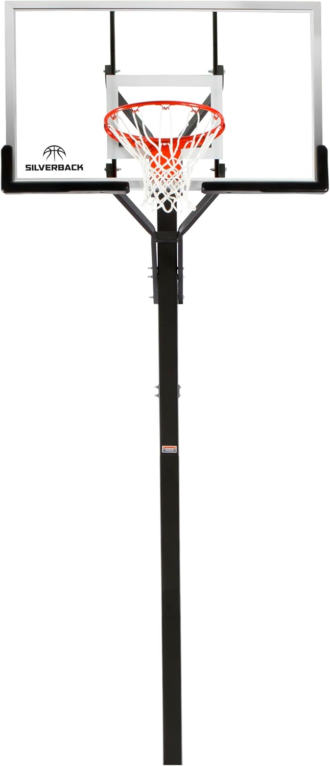 The Silverback SB54iG, our premier in-ground basketball hoop, features a tempered glass backboard and powder-coated steel pole that is directly installed into the ground and secured by concrete. The SB54iG uses a crank actuator to adjust the goal from the NBA and NCAA regulation rim height of 10 feet to the safety-approved height of 7.5 feet. The SB54iG comes complete with a pole and backboard pad to offer protection during lay-ups and a break-away rim that flexes under pressure during a dunk. Backed by a 5-year limited warranty, the Silverback SB54iG is a perfect hoop system for your family.
