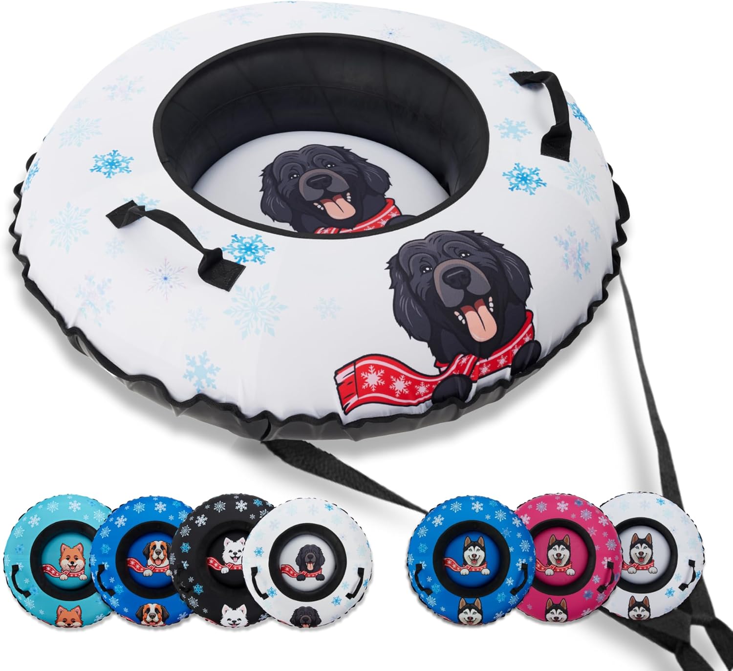 Unleash the thrill of winter with the EverVenture Snow Dogs Series Inflatable Snow Tube! Designed for adults and kids alike, this heavy-duty snow sled promises endless fun and adventure. Imagine gliding effortlessly down snowy hills on a snow tube sled that not only looks fantastic with its playful Snow Dog designs but delivers on performance. Our 47-inch (deflated) snowboogie is perfect for families looking to make unforgettable winter memories. Crafted from freeze-proof rubber, this snow tube sled is built to withstand the coldest of temperatures, ensuring durability and longevity. The 1000D base enhances speed and control, making it the ultimate choice for both novice and pro snow sledders. Our snow sledding tube design ensures stability and a smooth, magical ride every time. The Snow Dogs snow tube for adults and kids is not just about style and durability; it's about safety too. The sturdy construction and reinforced handles provide a secure grip, giving you peace of mind as you cruise down the slopes. Plus, its robust build makes it one of the most durable adult snow tube on the market, perfectly suited for endless winter fun. Ideal for families, our inflatable snow sleds offer endless fun for adults with kids. The spacious design of this snow tube inflatable can comfortably accommodate an adult and a child, making it a great way to bond with your little ones. And when it's time to pack up, the inflatable snow tube deflates easily and packs nicely into it's custom carry bag, ensuring convenient storage and transport. The EverVenture Snow Dog sledding tube for snow is versatile enough for any snowy adventure. Its design caters to thrill-seekers who crave the excitement of snow sledding while ensuring that the ride is smooth and enjoyable. So, grab your inner tube sled, gather the family, and head out for an epic snow day with EverVenture's Snow Dogs Series. Elevate your winter fun with these incredible inflatable snow tubes that are built to last and designed to delight!Winter snow tube with snow flakes