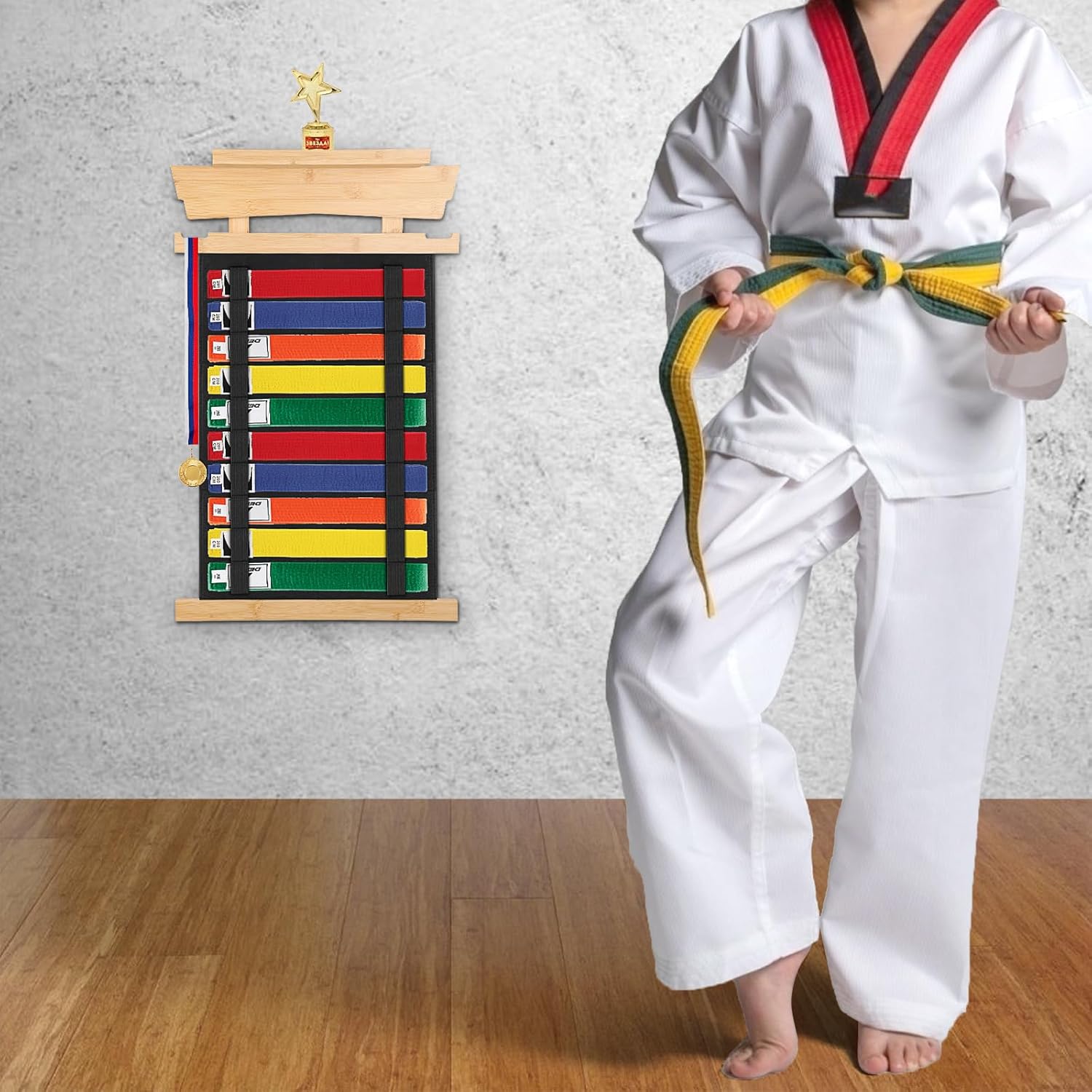 Bamboo martial arts belt display rack for conveniently holding 10 kinds of belts. There are 2 circular piers behind the taekwondo belt display rack to balance the contact gap between the upper and lower parts and the wall. Hanging design saves space, and facilitates hanging anywhere you want to display your belts and medal. The karate belt display rack keeps your martial arts belts organized and easily accessible. Specification: Material: Bamboo + Felt Net weight: 1100g Packing size: 43.5*16.5*7.5cm Packing included: 1 Pack Martial Arts Belts Rack (Belts Not Included) Note: 1. Due to manual measurement, please allow a difference of 1-3 cm. 2. Due to the difference between light and screen, the actual color may be slightly different from the pictures.
