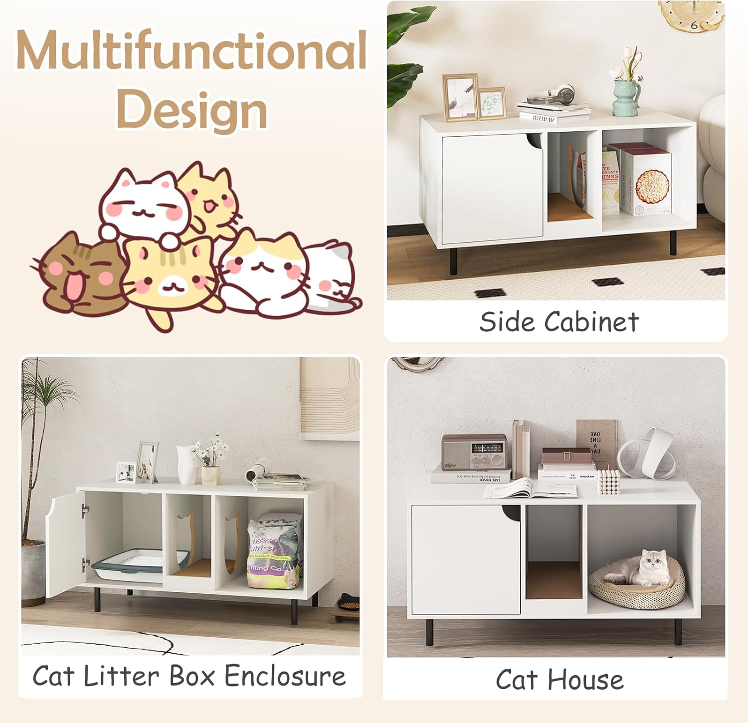 DescriptionCreate a Comfortable and Discreet Area for Your Lovely Furry Friends!This large cat litter box enclosure comes with 2 rooms, including an enclosed cabinet and an open compartment, which could meet the needs of toileting and resting. You can also use it to store cat supplies, and there is a large tabletop for displaying decorations. The enclosed area could effectively minimize unpleasant smells and prevent litter from being tracked outside, ensuring a cleaner and more pleasant living environment. And there is a detachable scratching board for cats to grind claws so as to catch much of splashed litter. Not only functioning as a hidden cat washroom, it can also serve as a storage cabinet, cat house, or side end table to complement your living space.FeatureServes as a discreet litter box cabinet, a stylish side table, and a cozy cat houseThe hidden area offers private space, reduces litter tracking and unpleasant smellsThe open compartment offers spacious space for placing a cat bed or cat suppliesComes with a large countertop to display decorations or serve as a resting spotEquipped with a scratching board for cats to scratch while reducing litter trackingThe scratching board is easy to move for easy maintenanceThe winding entry allows cats to seamlessly slip in and out while adding more funSupported by metal legs, stable and reliable, not easy to wobbleAdopts waterproof surfaces and elevated bottom, easy to cleanThe cabinet with a cutout handle is easy to open and close, facilitate interior cleaningComes with cute cat holes, add a playful element to the cat cabinetSpecificationColor: Black/WhiteMaterial: Engineered Board, MetalProduct Dimensions: 40” x 21” x 22”(L x W x H) Max Allowable Size of Litter Box: 15” x 39.5” x 15.5(L x W x H)Size of the Cat Scratching Board: 19” x 7” x 2”(L x W x H)Net Weight: 41 lbsPackage Includes:1 x Cat Litter Box Enclosure1 x User’s Manual