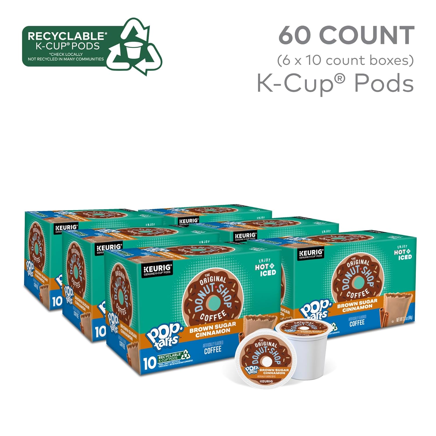 Get ready to dive headfirst into a cup of delicious coffee with The Original Donut Shop Pop-Tarts Brown Sugar Cinnamon flavored coffee K-Cup pods. We stacked flavors on top of flavors to reimagine the limits of coffee and turn every day into a delicious treat. Treat yourself to crazy good coffee bursting with notes of brown sugar sweetness, cinnamon flavor, and the signature straight-from-the-toaster taste of Pop-Tarts Brown Sugar Cinnamon toaster pastries. Brimming with the bold taste and aroma that gets you going and keeps you smiling, our deliciously uncomplicated coffee comes from a box as bright as the outlook you’ll have after every sip. Brew on the 10 oz setting for hot, or for iced, fill a cup with ice (do not use glass) and brew on the 6 oz setting. Then add milk or sugar and enjoy! The Original Donut Shop Coffee Pop-Tarts Brown Sugar Cinnamon flavored coffee K-Cup pods are compatible with all Keurig single serve coffee makers and brew up to 10 oz each. Simple. Delicious. And recyclable.* Enjoy the same great-tasting coffee you know and love, and when you’re done, just peel, empty, and recycle. *Check locally, not recycled in many communities.