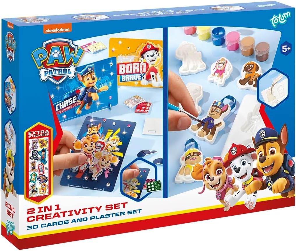 With this extra large craft set from PAW Patrol you can make no less than 2 different craft activities with super beautiful results: make 6 plaster pendants of all heroes from the PAW Patrol film and series, which you can paint with the supplied 6 colors of paint and brush and make luxurious 3D cards that you can decorate with moxaic stickers. Who are you going to surprise with a beautiful work of art? or will you decorate your room or later the Christmas tree with it? For boys and girls from 5 years old 2-in-1 craft set with everything you need for plaster hangers and 3D mosaic cards to keep it quiet and also fun to do together for hours of fun, and fine aftermathing of the film stimulates creativity and good for concentration and motor skills. A great gift for PAW Patrol fans tip: try different crafting techniques from Totum or from PAW Patrol Inside the PAW Patrol AW Patrol range by Totum you will also find other fun activities such as scratch and coloring booklet, sticker puzzle book, stamping, ironing beads, mug painting, jewelry making, plaster sets, diamond paint, sticker sets, see which one you like best, age appropriate, mix and match or combine with stickers for unique works of art. You do crafts with Totum !