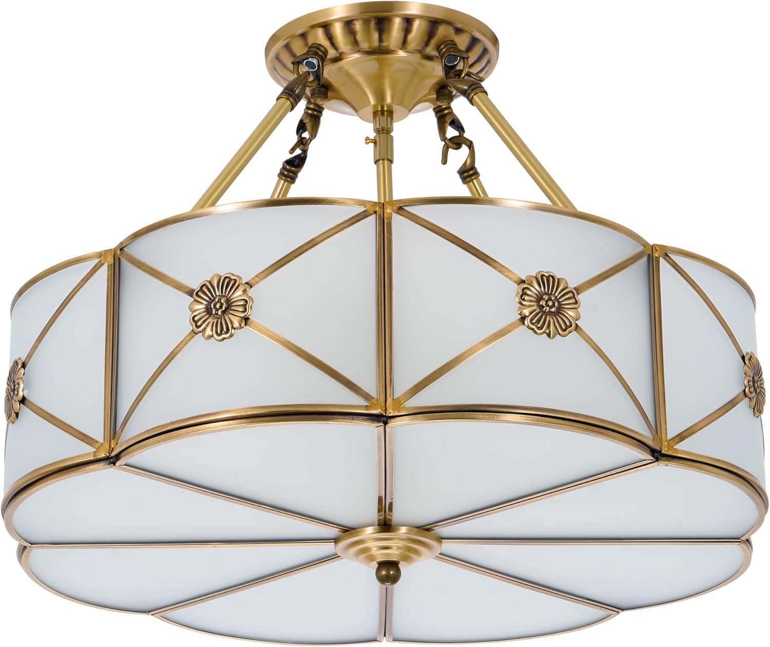 Product Introductions: efperfect ceiling light fixture is designed with classic vintage patterns, will definitely add some addition to your home lighting and decoration. Making your home a more enjoyable space. Specifications: Style: Vintage Style Ceiling Light Color: Gold+White Shade, Gold Light Frame Material: Metal, Handmade PVC Lampshade Size: D17"x H5.5", Side Hanging Chain: 8", Total Fixture Height: 14'' Voltage 110V, Wall Control. Light Source: E26 *4 (Bulbs Not Included) Compatible with various bulbs, eg. Incandescent, LED, CFL. Suitable for Kitchen Island Bar Living Room Dining Room Bedroom Study Porch ect Warm Tips: 1. Please check the dimensions before ordering,just to ensure it is suitable for your room. 2. Please check carefully the installation instructions before you are ready to install the chandelier. 3. Ensure the fixture is disconnected from mains power before installation.