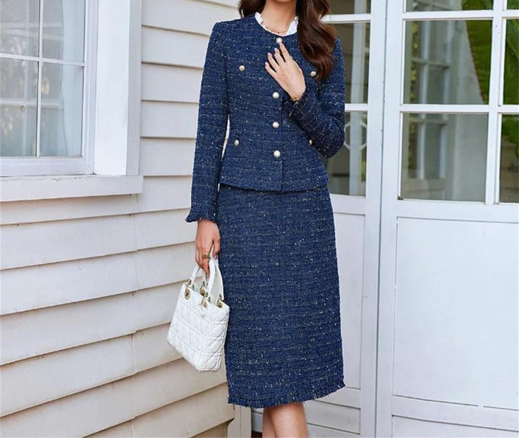 Discover our collection of women two piece skirt suit sets designed for elegance, comfort, and versatility. Each outfit is crafted with attention to detail, featuring a variety of styles such as single breasted, double breasted, belted, or cropped blazers paired with matching skirts. Whether you prefer a classic slim fit, modern tweed design, or stylish sequin detail, these sets bring sophistication to both formal and casual occasions.From professional office wear to elegant evening outfits, our suits offer options for every season. Lightweight short sleeve blazers with skirts are perfect for summer, while long sleeve wool blend and knit sets provide warmth and refinement for winter. Featuring A line skirts, pencil skirts, fishtail, or pleated styles。Designed for business meetings, interviews, weddings, or parties, these skirt suits combine practicality and chic fashion. Details such as bow collars, applique, beading, lace, mesh and ruffle hems , ensuring you stand out effortlessly. Pair them with heels or flats for a polished and feminine look that transitions seamlessly from office to evening.Our range includes casual denim skirt sets, vintage inspired tweed suits, and modern solid color designs. Choose from round neck, V neck, notched lapel, or stand collar styles to match your personal preference. Every set is made to balance style and comfort, making it an essential choice for confident women who value elegance in daily life and special events.business outfit office wear formal skirt suit blazer set elegant professional attire party fashion work casual slim fit double breasted single breasted tweed sequin vintage modern classic wedding interview
