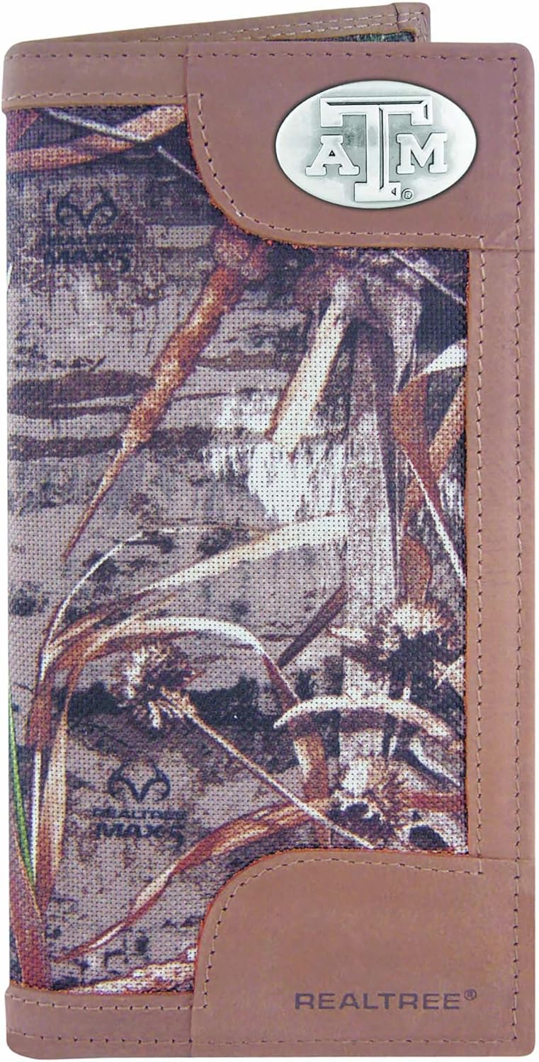 Carry your Arkansas Razorbacks school spirit and your enthusiasm for the outdoors with you at all times. This genuine Realtree camouflage pattern secretary-style roper wallet is accented with brown genuine leather, decorated with a silver gun metal Concho and features bill and checkbook compartments, an ID window, six card slots, photo sleeve insert and spare key holder. Attractively boxed to make the perfect gift for the ultimate Razorbacks fan.