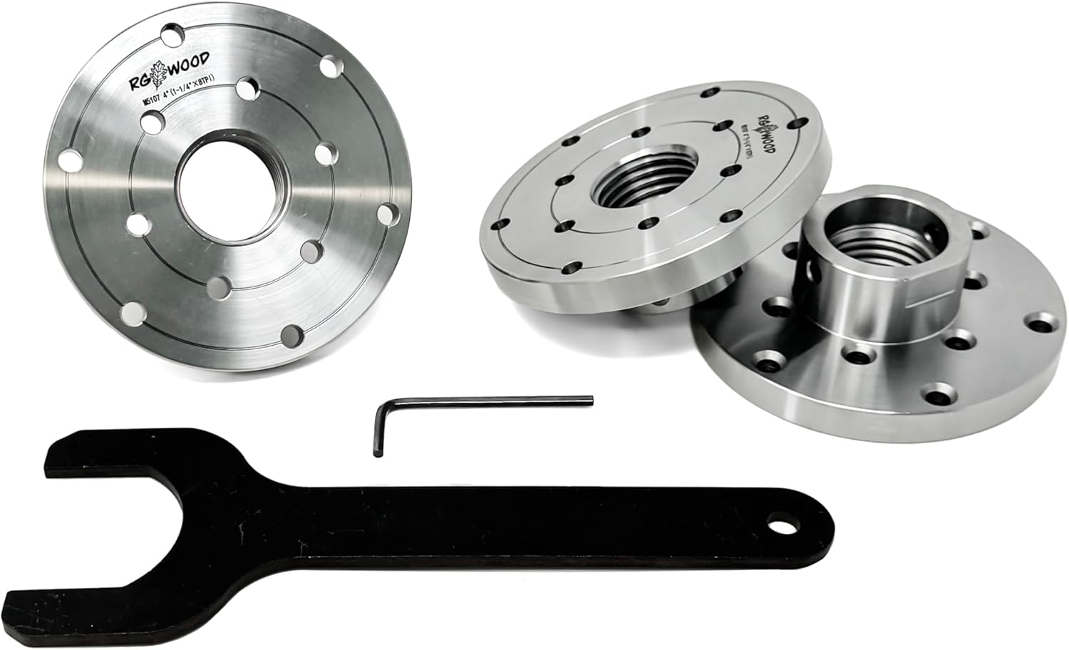 3 pc set of 4” Faceplates to fit wood lathes with a 1-1/4” x 8tpi spindle. 42mm spanner wrench included for ease of removal from lathe. 1-1/4” depth is adequate for most lathes – some Laguna and Powermatic lathes have a longer spindle and may require a spacer behind the faceplate. 2 locking set screws to lock to your lathe for reverse turning. 12 mounting holes in 2 concentric circles for multiple fastening options.