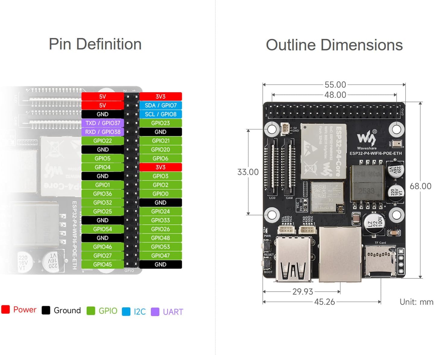Introduction ESP32-P4-WIFI6-POE-ETH is a multimedia development board based on ESP32-P4 and ESP32-C6, Supports Wi-Fi 6 and Bluetooth 5 (LE) wireless connectivity. It features rich Human-Machine interfaces, including MIPI-CSI (with integrated Image Signal Processor), MIPI-DSI, SPI, I2S, I2C, LED PWM, MCPWM, RMT, ADC, UART, TWAI, etc. Additionally, it supports USB OTG 2.0 HS, onboard RJ45 Ethernet port with PoE functionality. Features High-performance MCU with RISC-V 32-bit dual-core and single-core processors 128 KB HP ROM, 16 KB LP ROM, 768 KB HP L2MEM, 32 KB LP Static RAM, 8 KB TCM 32MB PSRAM in the chip's package, with onboard 32MB Nor Flash Integrated PoE module, more flexible for power supply Powerful image and voice processing capability. Provides image and voice processing interfaces including JPEG Codec, Pixel Processing Accelerator, Image Signal Processor, H264 encoder Commonly used peripherals such as MIPI-CSI, MIPI-DSI, USB 2.0 OTG, Ethernet, SDIO 3.0 TF card slot, microphone, speaker header and RTC Batt. header, etc. Adapting 2*20 GPIO headers with 28 x remaining programmable GPIOs Security features: Secure Boot, Flash Encryption, cryptographic accelerators, and TRNG. Additionally, hardware access protection mechanisms help to enable Access Permission Management and Privilege Separation Package Content ESP32-P4-WIFI6-POE-ETH x1 SH1.0 4PIN cable ~150mm x2 1217 8Ω 2W speaker x1 2.4G antenna x1 Screws pack x1 Note: Online Dev Resources and Tutorials to help you easily get started. Please feel free to contact us with any questions.