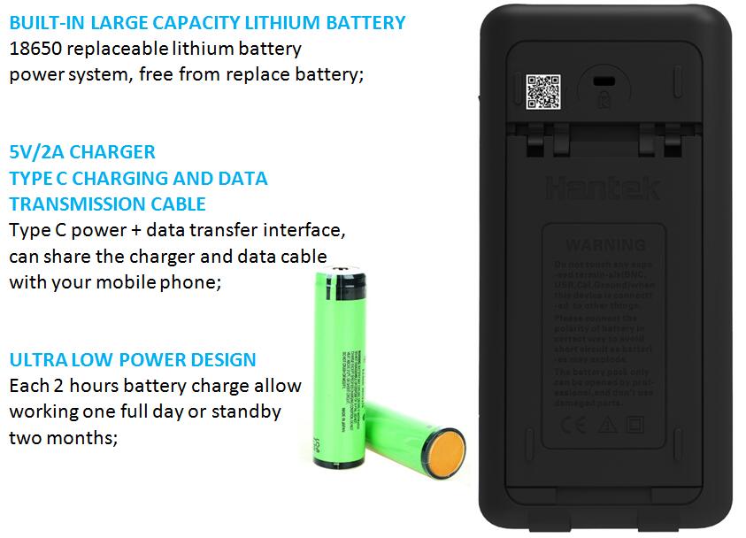 Key features: * 3 in one Oscilloscope + Waveform Generator + Multimeter* Intelligent charging control. * Ultra-low power design: Type C charging interface, after every recharge of 2 hours, the device can be used continuously for a full day or standby more than two months; * Large-capacity lithium battery power supply: 18650 replaceable lithium battery power system, free from replace battery; * 5V/2A charger + Type C charging cable: Type C power + data transfer interface, can share the charger and data cable with your mobile phone; * AUTO one-key test: Magic tool and essential function for test newbie; * Volume small, one hand holding: The 45 degree suspension bracket design provide you a work station anywhere anytime; * One key page out, quick compare two groups of reference waveforms + 6 groups of waveforms storage, simple and effective; * Digital voltmeter function: automatic frequency and amplitude measurement, convenient and worry-free; * Its cursor measurement functionsupports time and voltage manual measurement, and measure the required waveforms accurately; * One-click switching its Chinese and English language menu; * Color LCD screen: exquisite and smooth lines make the waveforms clear and undistorted when magnify; * Minimalist keyboard design simplify operation, convenient to use; * Unibody casing: fine touch feeling, favorable impact resistance, outstanding heat resistance, easy to disassemble; * Self-calibration function: free from level drift after long time unused; * Universal multimeter function: voltage, current, resistance, diode, capacitor, on-off test; * Waveform generator output function: output sine, square, triangle, trapezoidal and other waveforms; sine up to 25MHz; * Function of video help:scan code on back of machine to get help of video course; * The PC software supports windows7/8/10 32-bit and 64-bit. *