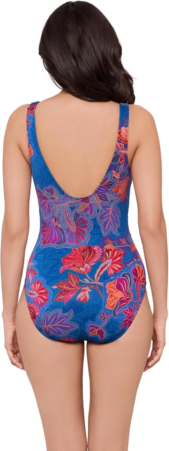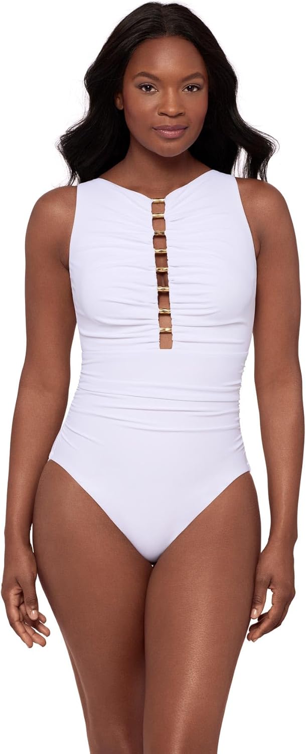 Sculpt, smooth, and stun in a one-piece that does it all. Designed with powerful Miratex fabric, this suit provides all over body control, shaping and slimming your figure from top to bottom. The built-in underwire bra lifts and supports, while a plunging high neckline adds a modern edge, accented with sleek hardware down the center front for an extra dose of glamour. Thoughtfully draped fabric works its magic to conceal your tummy, creating a tightened, toned midsection so you can step onto the sand with total confidence. "Look 10 lbs. lighter in 10 seconds” is more than just a tagline – it’s a promise. Our unique and innovative Miratex® fabric delivers three times the control of ordinary swimwear fabrics while remaining totally comfortable and allowing full range of motion. There are no panels or linings – just slimming, slenderizing control for all over shaping you need to see to believe. All Miraclesuit swimwear features sophisticated prints and sleek, contemporary styling that’s on trend and totally timeless. At Miraclesuit, we believe in curves. Strategic draping and shirring create an hourglass shaped silhouette, which helps highlight your best features. This swimsuit is made for any body type and flatters every unique figure. When a woman wears her Miraclesuit, she feels confident and beautiful both inside and out. Miraclesuit is created like no other swimsuit in the world. Try it on once and you'll love it forever, guaranteed.