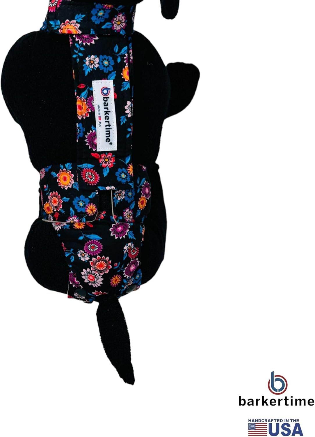 Handcrafted to perfection so your furbaby can stay clean and comfortable while you have complete peace of mind. Suitable for both male and female dogs with incontinence, marking habits, excitable urination or heat cycles. Specifically designed for the \\\\\\\\\\\\\\\"Houdini\\\\\\\\\\\\\\\" escape-artist dogs that have difficulty keeping diapers on. Snap closure around the tail area allows for maximum adjustability to your dog\\\\\\\\\\\\\\\'s anatomy. Perfect alternative to the traditional belly band for male dogs.Size ChartPlease go up one size if your dog is between sizes Size XS: Waist 9 - 2 inches, Neck 5 - 8 inches, Neck to Waist 5 - 7 inches, Neck to Tail 10 - 12 inches Size S: Waist 12 - 15 inches, Neck 8 - 11 inches, Neck to Waist 7 - 10 inches, Neck to Tail 10 - 13 inches Size M: 15 - 18 inches, Neck 12 - 15 inches, Neck to Waist 10 - 13 inches, Neck to Tail 13 - 17 inches Size L: 18 - 22 inches, Neck 16 - 19 inches, Neck to Waist 12 - 17 inches, Neck to Tail 13 - 22 inches Size XL: 22 - 30 inches, Neck 20 - 23 inches, Neck to Waist 14 - 20 inches, Neck to Tail 20 - 26 inches Size XXL: 30 - 43 inches, Neck 23 - 26 inches, Neck to Waist 17 - 25 inches, Neck to Tail 27 - 36 inches Check out Barkertime on Amazon for more options for pet diapers, incontinence products, pet fashion items and other accessories made in USA.